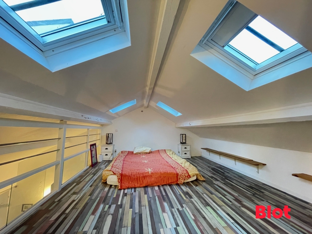 À l'étage, un coin nuit en mezzanine, accessible par un escalier, offre un espace cosy et intimiste, tout en conservant une belle sensation de lumière et d'ouverture.