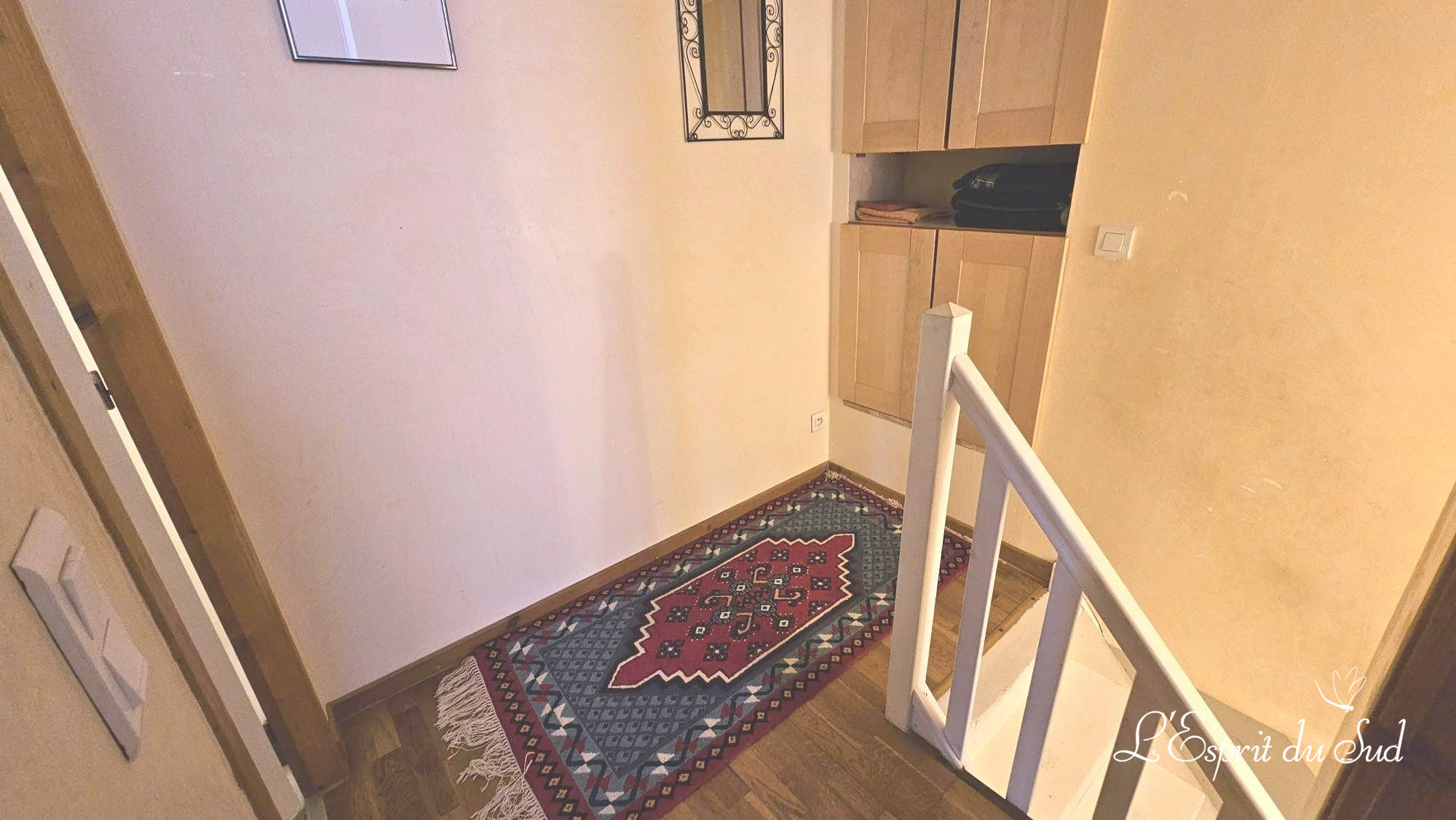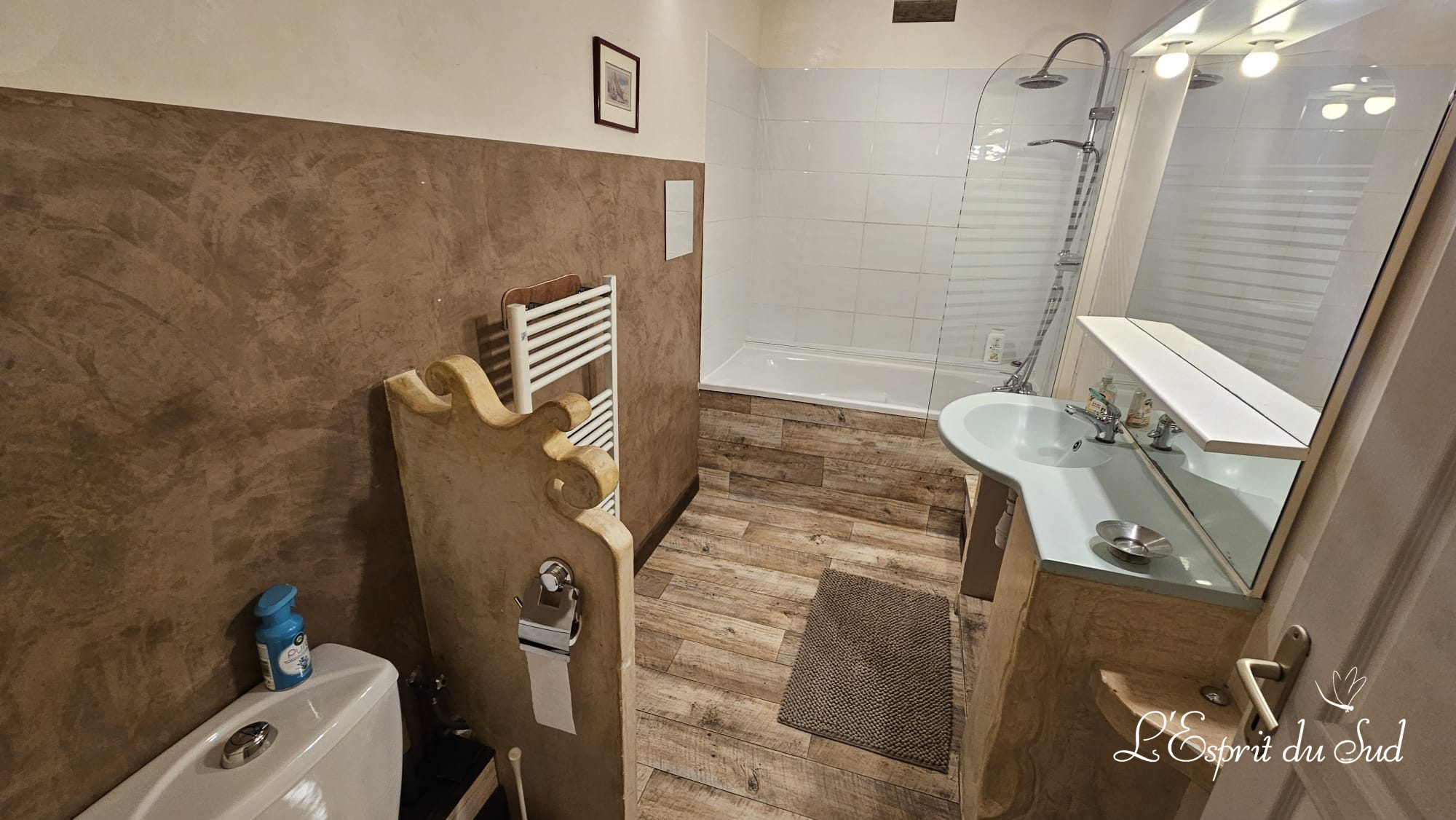 Au 1er, un petit palier avec placard, une chambre sur un joli plancher, d'environ 14m2, avec placard et penderie, une salle de bains avec baignoire, toilettes, sèche serviettes. Vous aimerez sans doute le tadelakt mis en oeuvre. Le lit ainsi que le canapé du salon resteront là, bien sages.