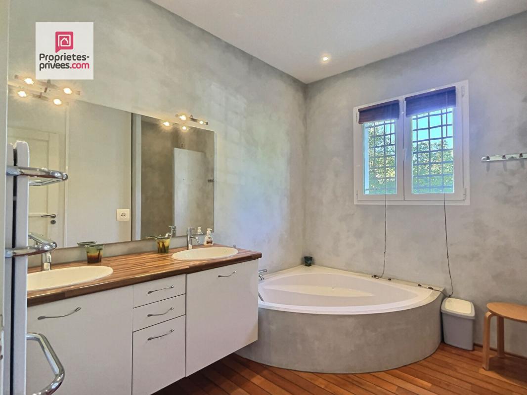 Elle se compose un joli hall d'entrée et d'une belle pièce de vie exposée sud avec baies à galandage, et d'une cuisine meublée et équipée ouvrant sur une terrasse. Côté nuit vous retrouverez 3 grandes chambres avec placards, 2 wc, une salle de bain avec baignoire d'angle et douche, une buanderie avec de nombreux rangement et un accès direct au double garage. Au 1er étage un bel escalier tournant vous emmènera à la suite parentale de + de 30 m² avec salle de bain ( douche et baignoire et wc)