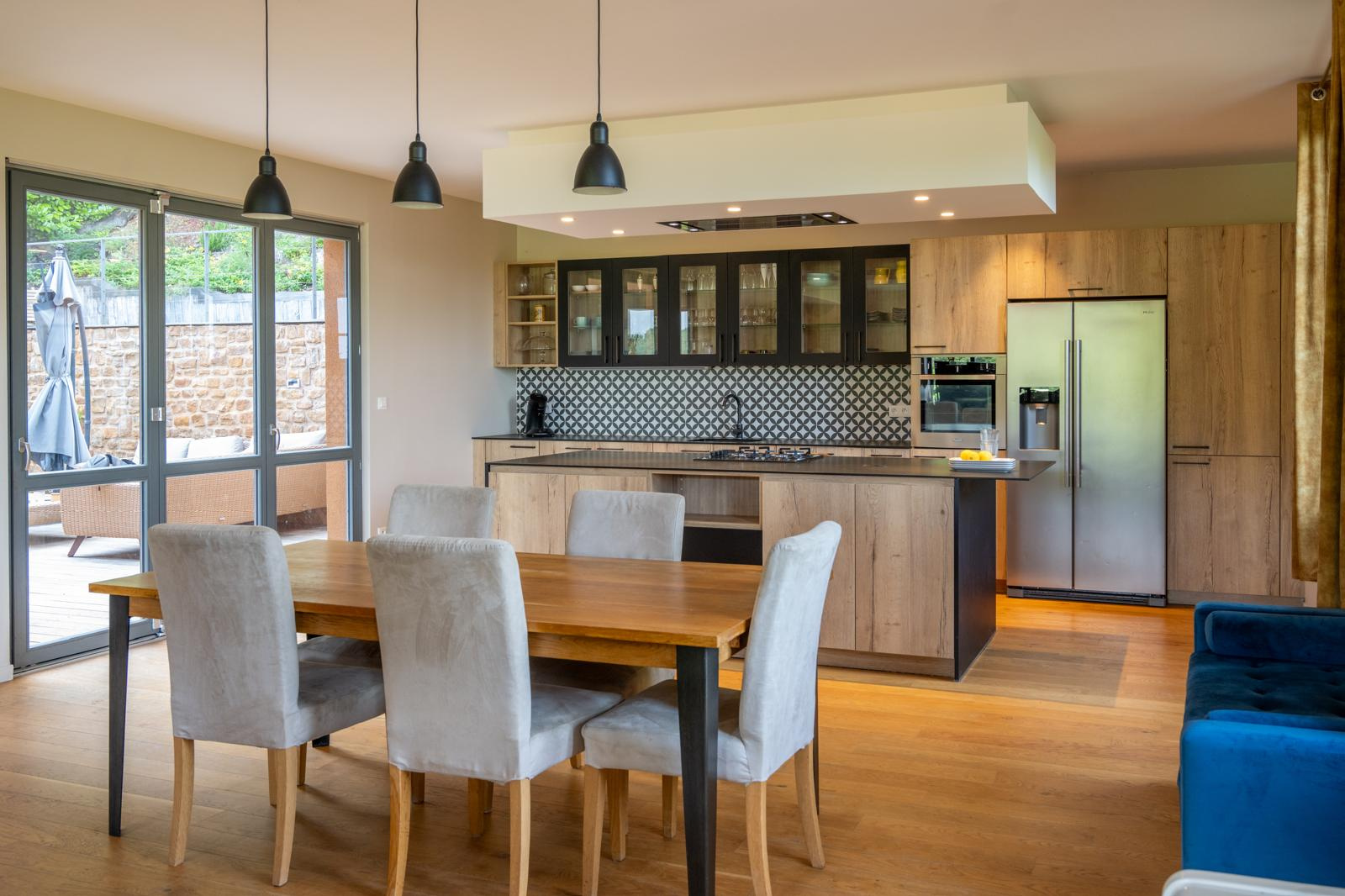 CD IMMOBILIER vous présente en exclusivité cette maison d'architecte achevée en 2022 à Poleymieux au mont d'or. Lumière, volumes et matériaux ont été définis pour un confort exceptionnel sur 211 m2. Les façades en pierres dorées offrent le charme de l'ancien dans un environnement privilégié, et tout le confort moderne est présent dans l'agencement intérieur. Lumineuse en toute saison grâce à sa quadruple exposition, elle offre un espace de vie de 105 m2 sur terrasse et jardin avec piscine. Un salon de réception confortable offre une vue panoramique sur la vallée, et permet de profiter de la chaleur douce de sa cheminée. La cuisine aménagée sur mesure bénéficie de larges plans de travail ainsi que de tous les équipements. Le parquet en chêne, la cheminée traversante, le mur entièrement vitré sur vue, les nombreuses ouvertures et baies sont autant d'exemples des prestations de qualité réalisées. Chaque matériau à été choisi avec soin. L'étage comporte un vaste dégagement, lequel dessert deux chambres master avec dressings et salles d'eau contemporaines de 21 et 24 m2, deux chambres de 12 et 13 m2 avec placards aménagés sur mesure, une salle de bains, et une buanderie. Les salles d'eau comprennent de véritables douches italiennes réalisées dans les règles de l'art avec des grès cérame aux sobres motifs gravés.