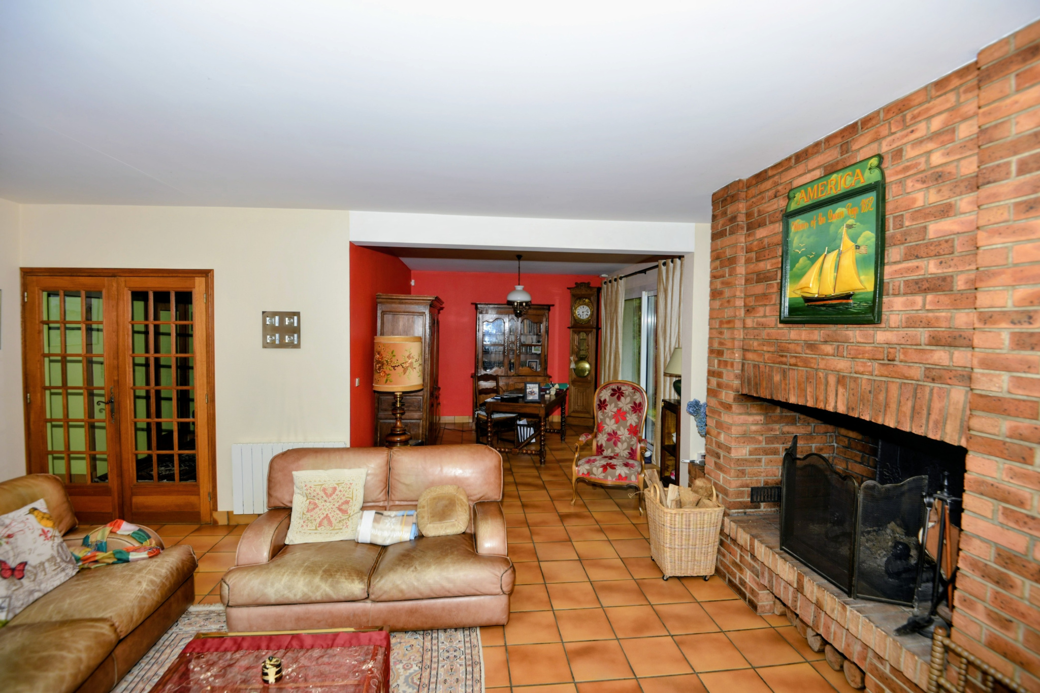 Par une belle entrée vous accédez au séjour / salon de 53 m2 avec cheminée foyer ouvert - 2 Baies vitrées coulissantes donnent accès au jardin.