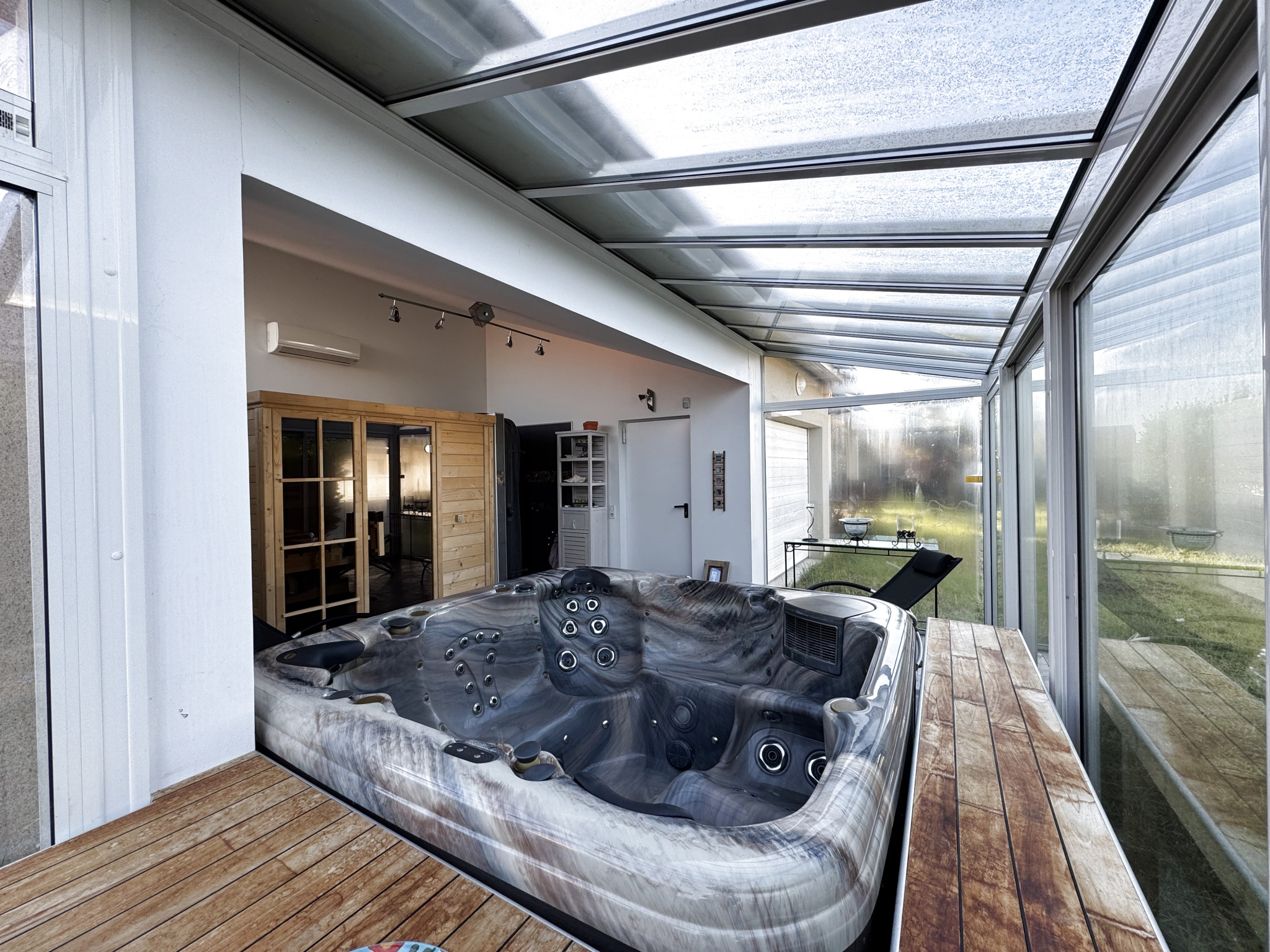 La maison dispose également d'un garage de 23 m2 donnant accès à une dépendance aménagée en espace bien-être. Cet espace unique comprend un sauna, une douche, une climatisation réversible et un superbe spa 8 personnes. Pensé comme un véritable lieu de détente, il offre un accès direct au jardin et permet de profiter de moments de relaxation tout au long de l'année.