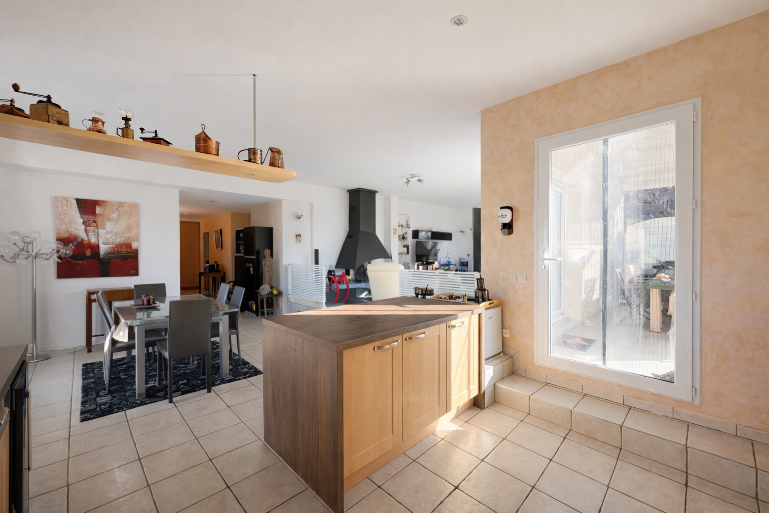 Le coeur de la maison se compose d'un vaste espace de vie d'environ 60 m2, pensé pour la convivialité. La cuisine entièrement équipée s'ouvre sur une salle à manger lumineuse de 28 m2, exposée est et ouest, avec un accès direct à la terrasse côté est. Le séjour, légèrement en retrait et accessible par deux marches, offre une surface de 29 m2. Il se distingue par sa cheminée mixte insert et poêle, ainsi que par sa triple exposition sud, est et ouest, offrant une luminosité remarquable et une belle continuité avec l'extérieur.