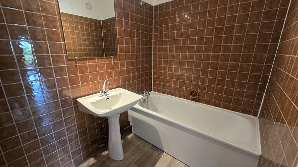 Appartement F3 dans environnement verdoyant : hall d'entrée, cuisine donnant sur une loggia, séjour-salon donnant sur un grand balcon, deux chambres, wc, salle de bains.