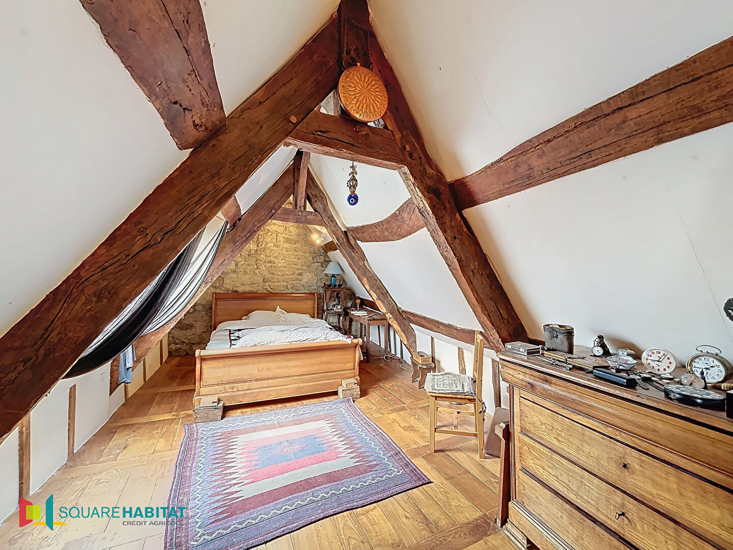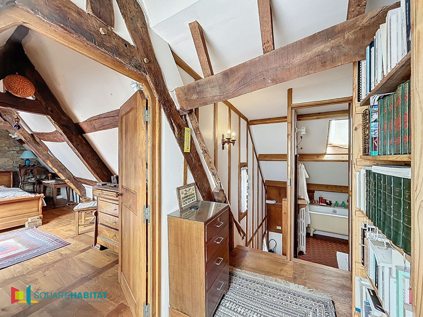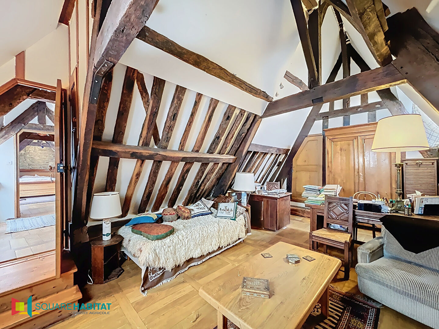 Au 2ème niveau, sous une magnifique charpente, vous trouverez un immense bureau de 30m², une chambre , une salle de bains et wc