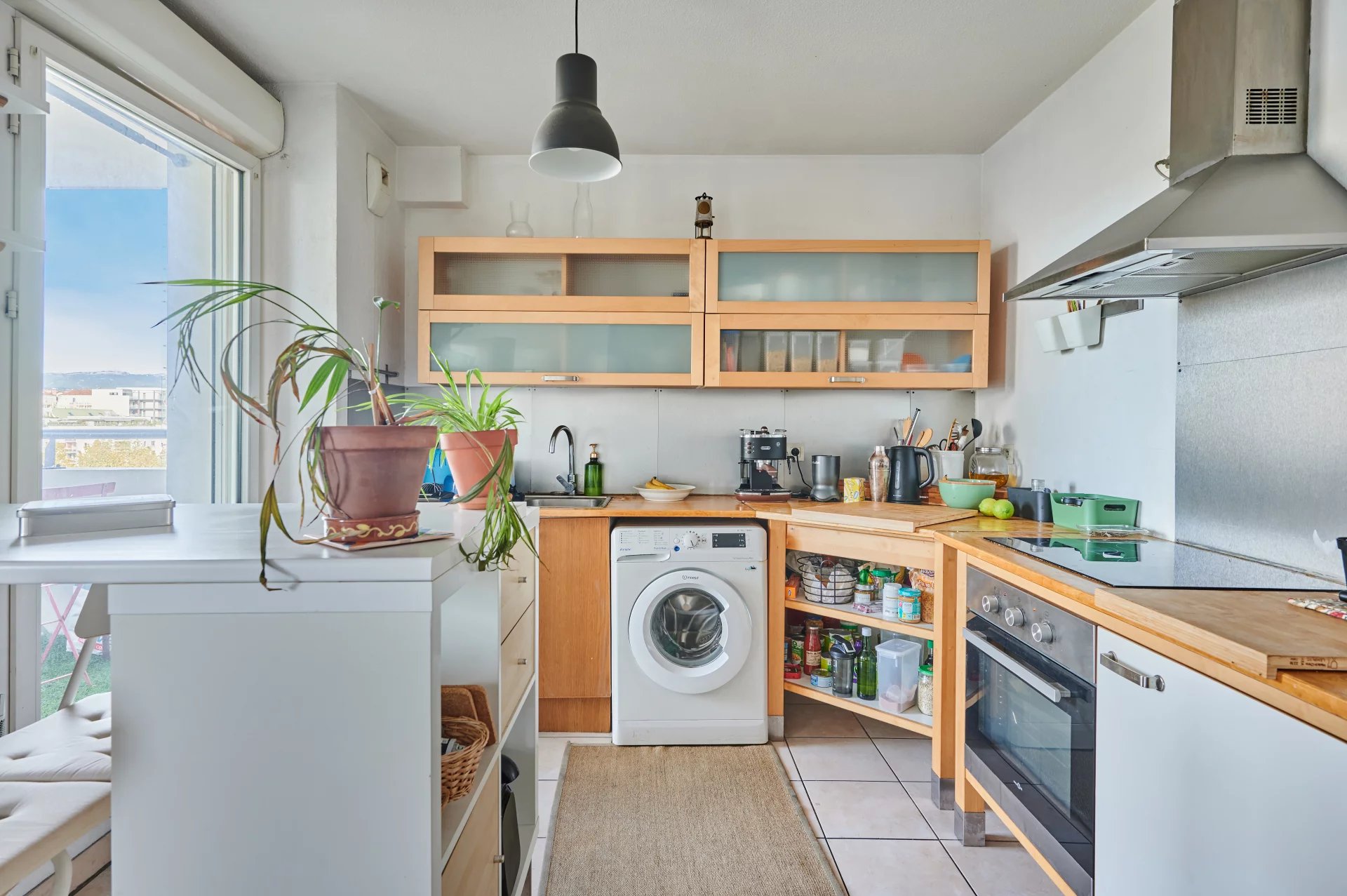 Le salon spacieux et lumineux offre un cadre de vie agréable, avec une vue imprenable depuis le balcon. La cuisine moderne est ouverte et bien agencée, idéale pour cuisiner en toute simplicité.