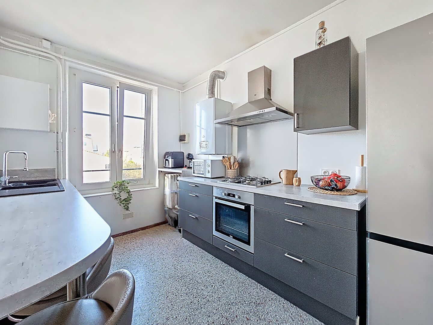 - Un séjour lumineux et sans vis à vis, ouvert sur une cuisine équipée au charme ancien, avec son sol en granito d'origine.