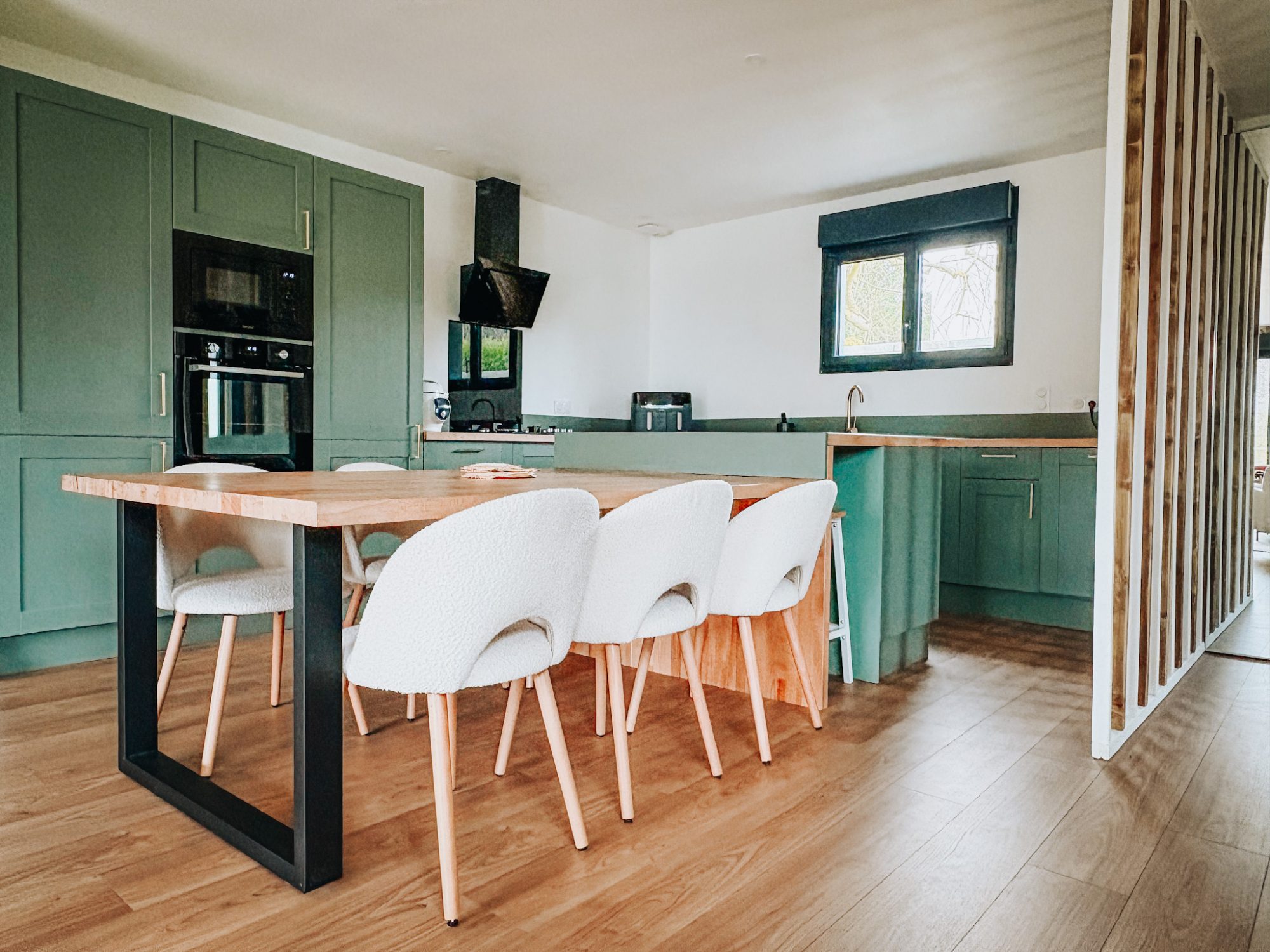 Le coeur de la maison s'articule autour d'un vaste espace de vie lumineux, où le salon dialogue naturellement avec une grande cuisine vert sauge, élégante et fonctionnelle. Son îlot central prolongé d'une table intégrée devient un lieu de partage, pensé pour les instants du quotidien comme pour les moments conviviaux.