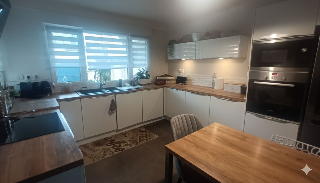 Construite sur 2 niveaux, la maison possède au rdc : Une entrée menant à une vaste cuisine dinatoire équipée, un salon/salle à manger ouvrant sur le jardin, un WC et un garage.
