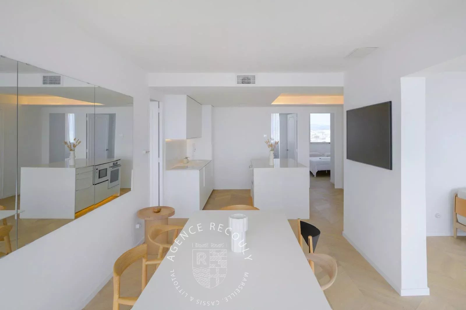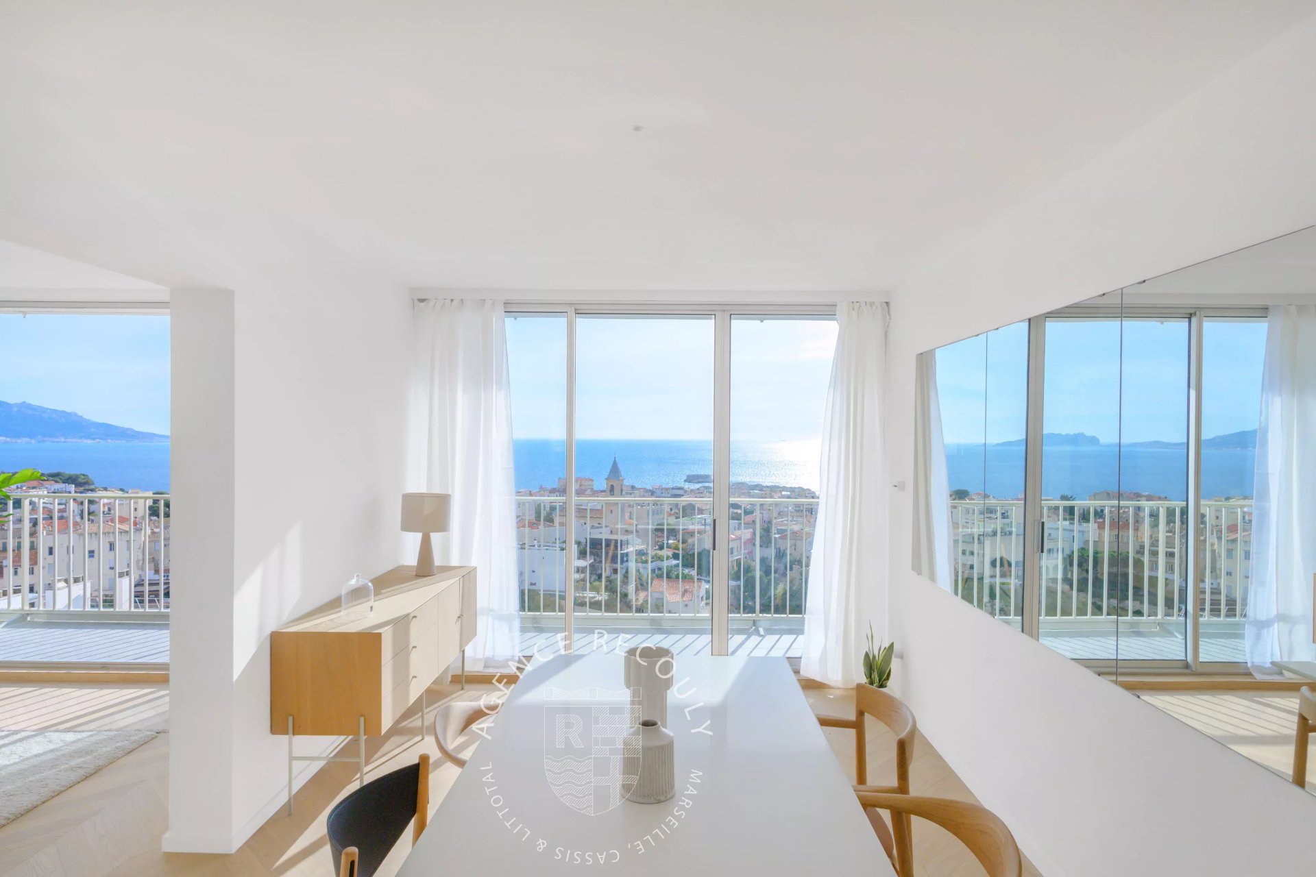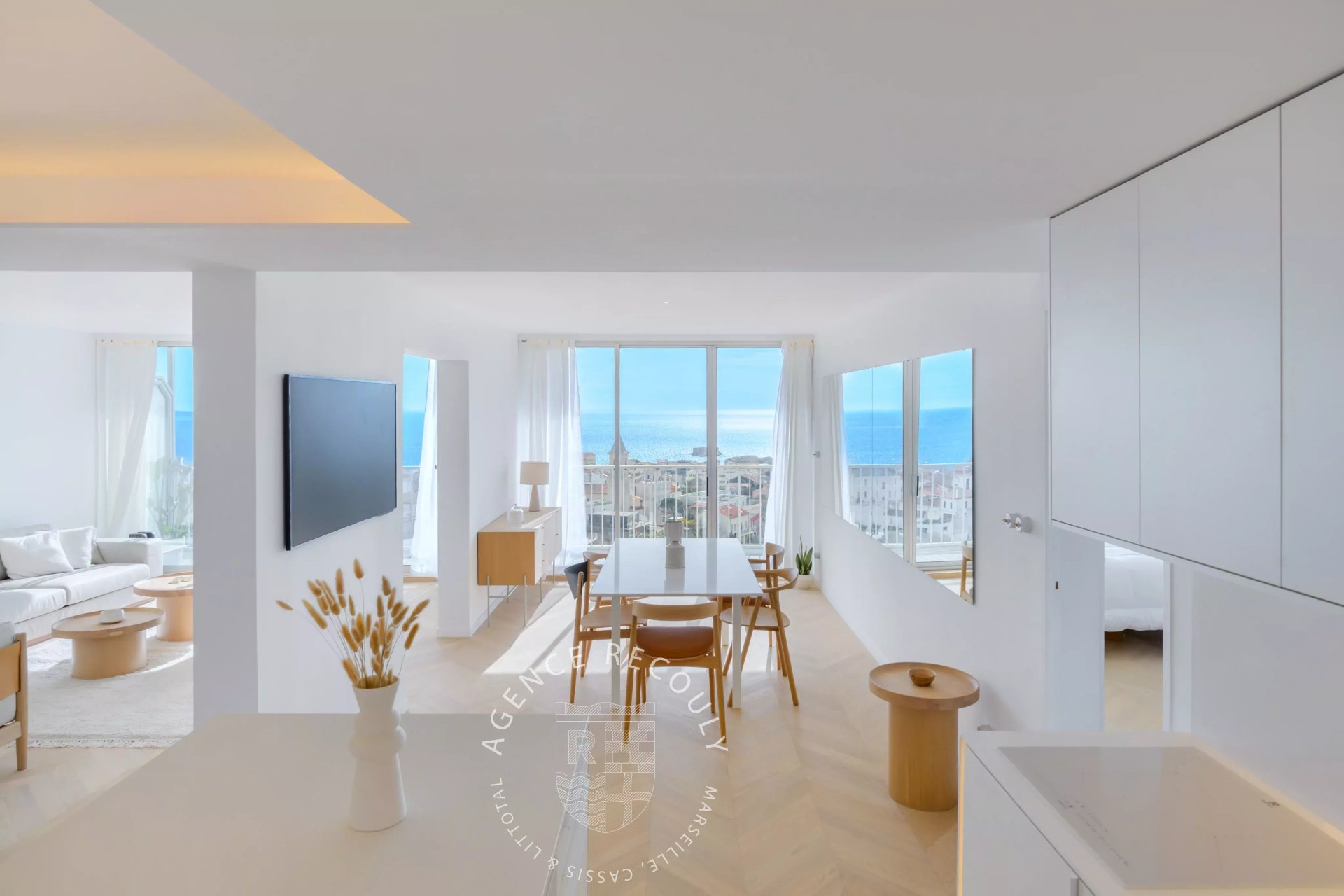 Cet appartement lumineux de 93 m2 loi Carrez offre une vue spectaculaire sur la mer depuis chacune de ses pièces. Il s'ouvre sur une vaste pièce de vie où la vue sur la baie de Marseille vous transporte immédiatement. Au sol un parquet chêne clair posé en point de Hongrie, une cuisine ouverte aux matériaux haut de gamme est entièrement équipée, un espace salon et salle à manger disposent de grandes baies vitrées comme des tableaux sur la mer et se prolongent par la terrasse face à la mer.