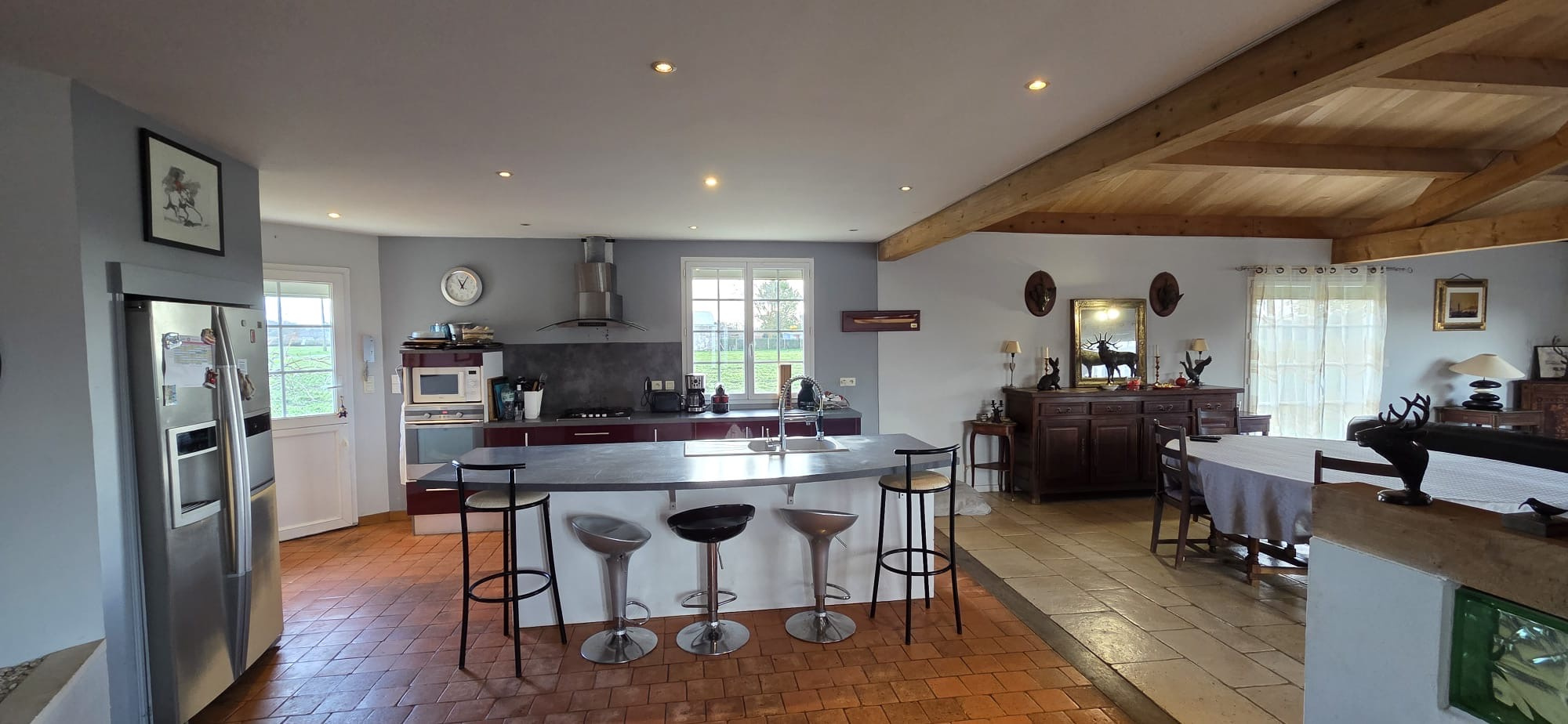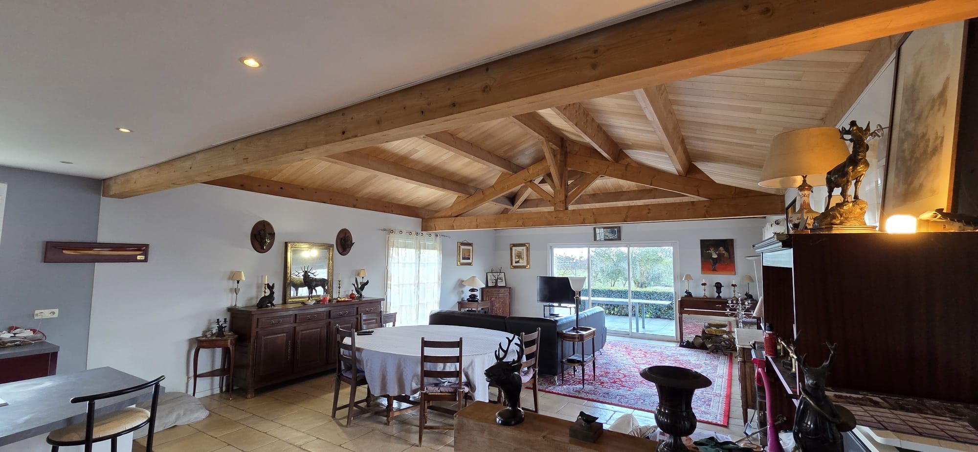 L'agence LG IMMO Cabinet Garéché vous propose un pavillon de plain-pied construit en 2008, d'une superficie totale de 163 m2, offrant confort et praticité. Il se compose d'une vaste pièce de vie de 78 m2 avec une magnifique charpente apparente, comprenant un salon/salle à manger et une cuisine ouverte avec ilôt central, et un cellier de 8 m2 avec chauffe-eau et branchement machine. La partie nuit comprend une salle d'eau de 11 m2 équipée d'une douche à l'italienne et de deux meubles vasque, un WC indépendant et quatre chambres de 10 m2, 11,70 m2 avec dressing, 11,40 m2 et 11,75 m2 avec accès au jardin. La pièce de vie dispose d'une belle luminosité avec ses ouvertures sur 3 façades permettant de profiter des rayons du soleil à tout moment de la journée et s'ouvre sur une terrasse sans aucun vis-à-vis. Plusieurs dépendances, non attenantes, complètent ce bien, notamment un garage de 36 m2, une dépendance d'environ 23 m2 et un box en bois de 33,70 m2. L'ensemble est édifié sur un terrain clos de 1 746 m2 avec portail électrique et accès goudronné jusqu'au bout des bâtiments. Le chauffage est assuré par un plancher chauffant et l'assainissement par une fosse septique. Les menuiseries sont en PVC double vitrage avec volets électriques centralisés + volets bois. La taxe foncière est de 1031 EUR. Pour toute information complémentaire, contactez votre agence LG IMMO au 05 46 97 27 11 ou par mail à cabinet-gareche@lgimmo.net