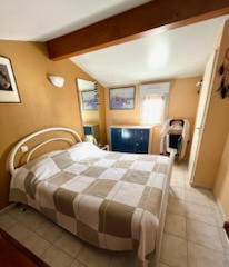 A l'étage, une chambre en mezzanine offre un espace intime et confortable, avec une belle hauteur sous plafond, apportant charme et caractère à l'ensemble.