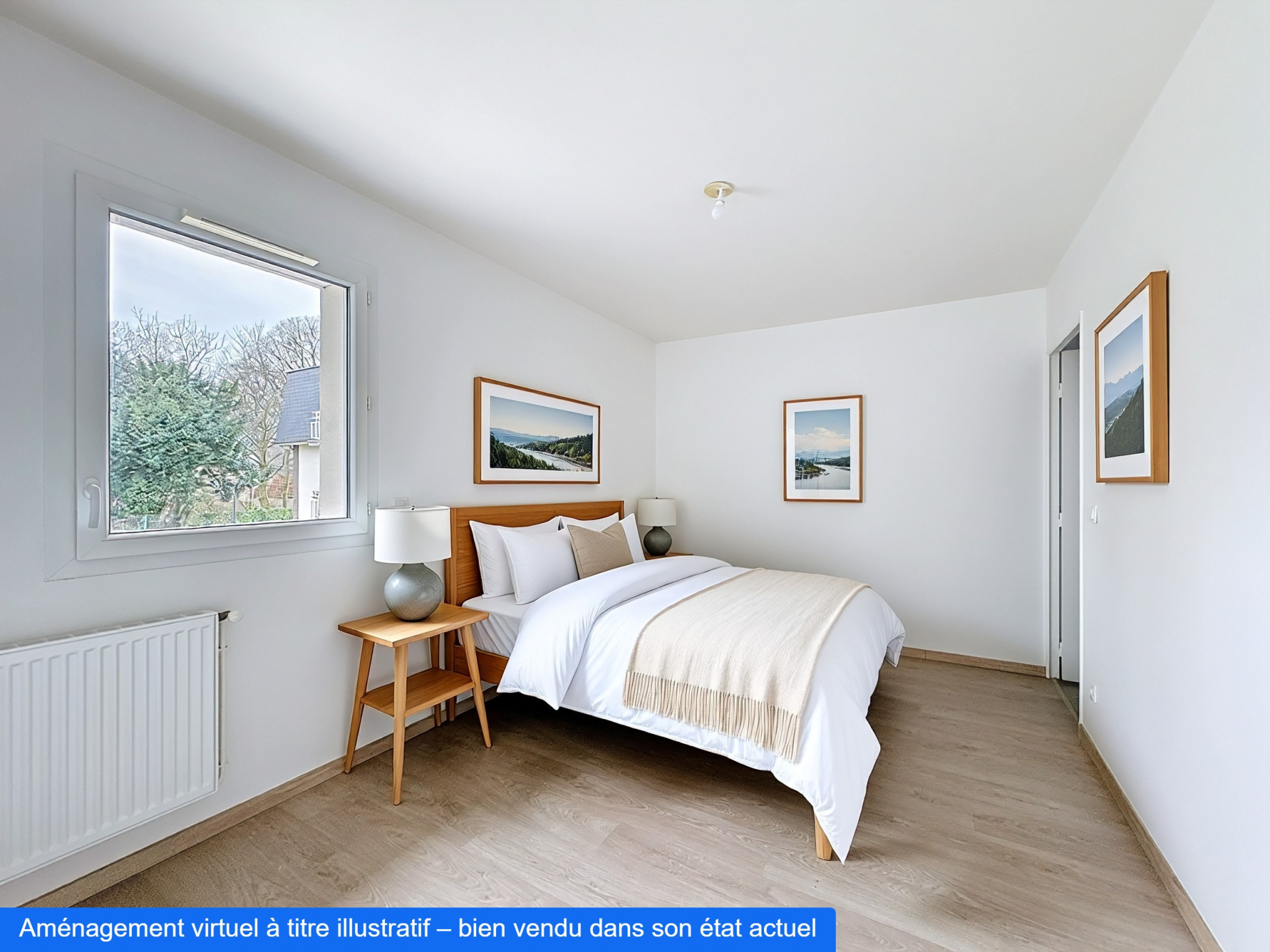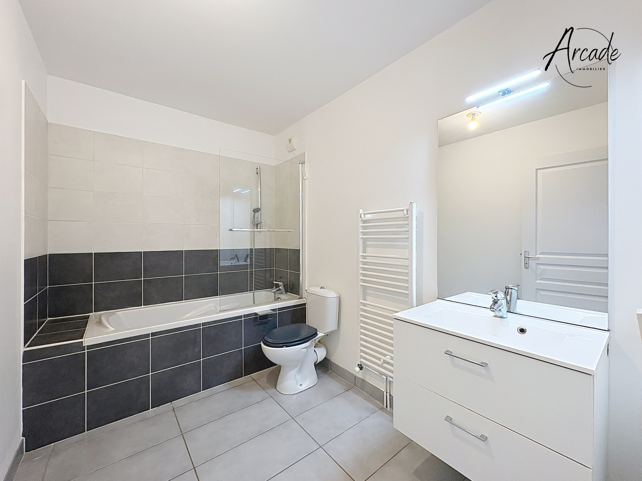 Entrée, séjour avec cuisine USA 24 m2, balcon 6 m2 exposé ouest, chambre, salle de bains + wc.