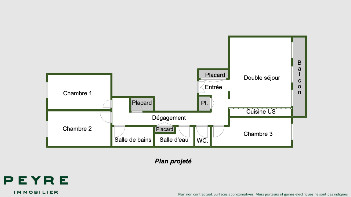 L'agencement est le suivant : entrée, double séjour avec balcon de 6 m2, cuisine séparée, 2 ou 3 chambres, salle de bains, salle d'eau, placards et WC séparés.