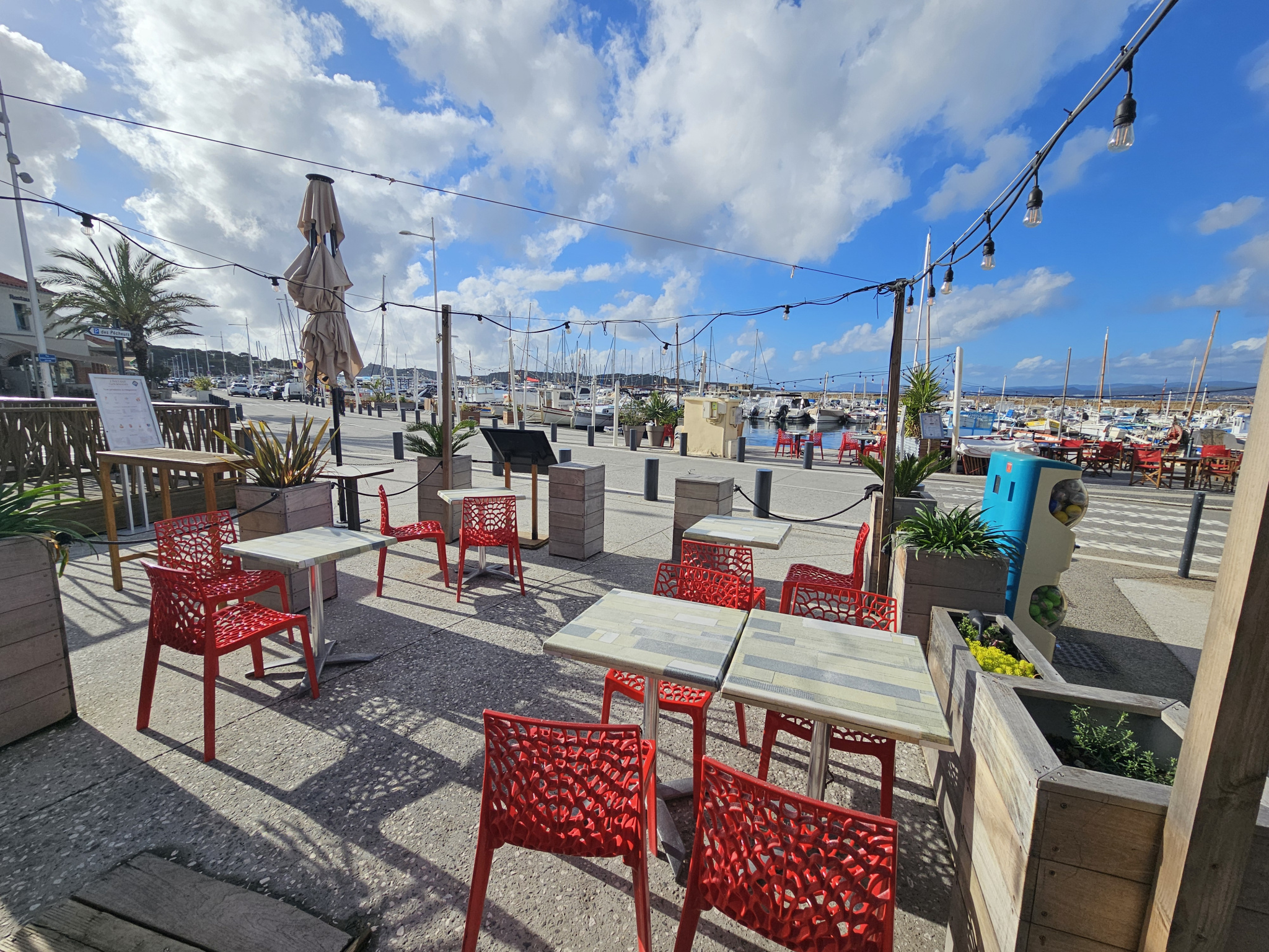 une terrasse exceptionnelle directement en bord de port, les pieds dans l'eau, offrant un cadre unique et très recherché par la clientèle.