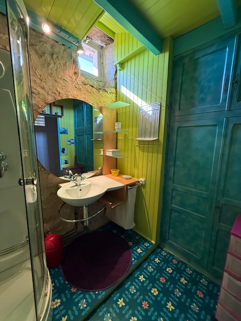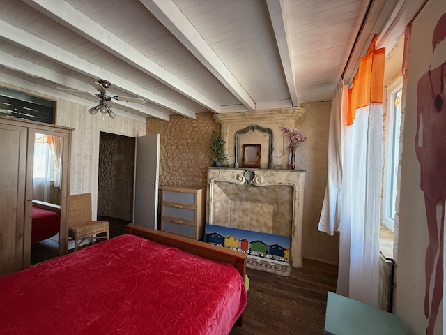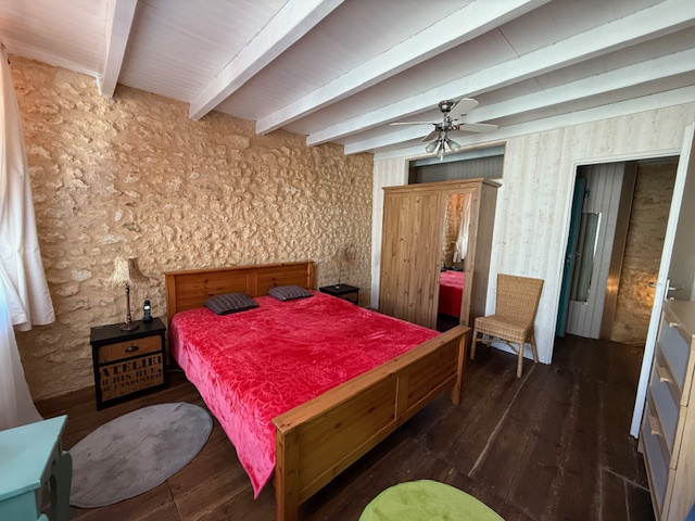 - Étage : chambre de 14,70 m2 avec une jolie cheminée en pierres décorative (non fonctionnelle), salle d'eau avec cabine de douche, WC, lavabo et placard, palier de environ 4,40 m2.