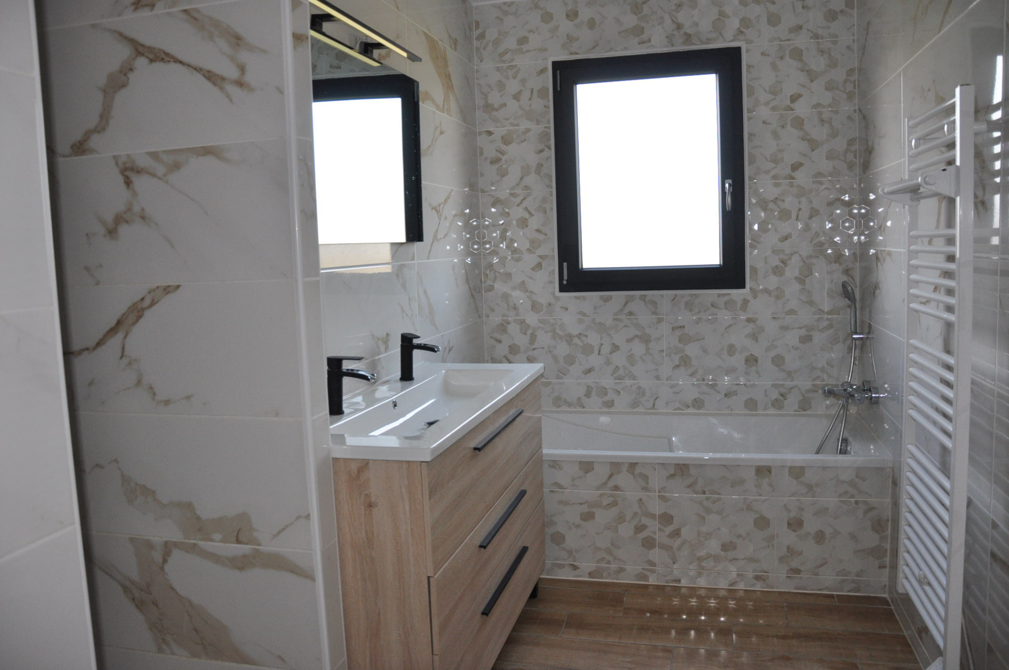 Baies vitrées en aluminium et fenêtres en PVC et volants roulants. Chauffage au sol par pompe à chaleur. Tout à l'égout.