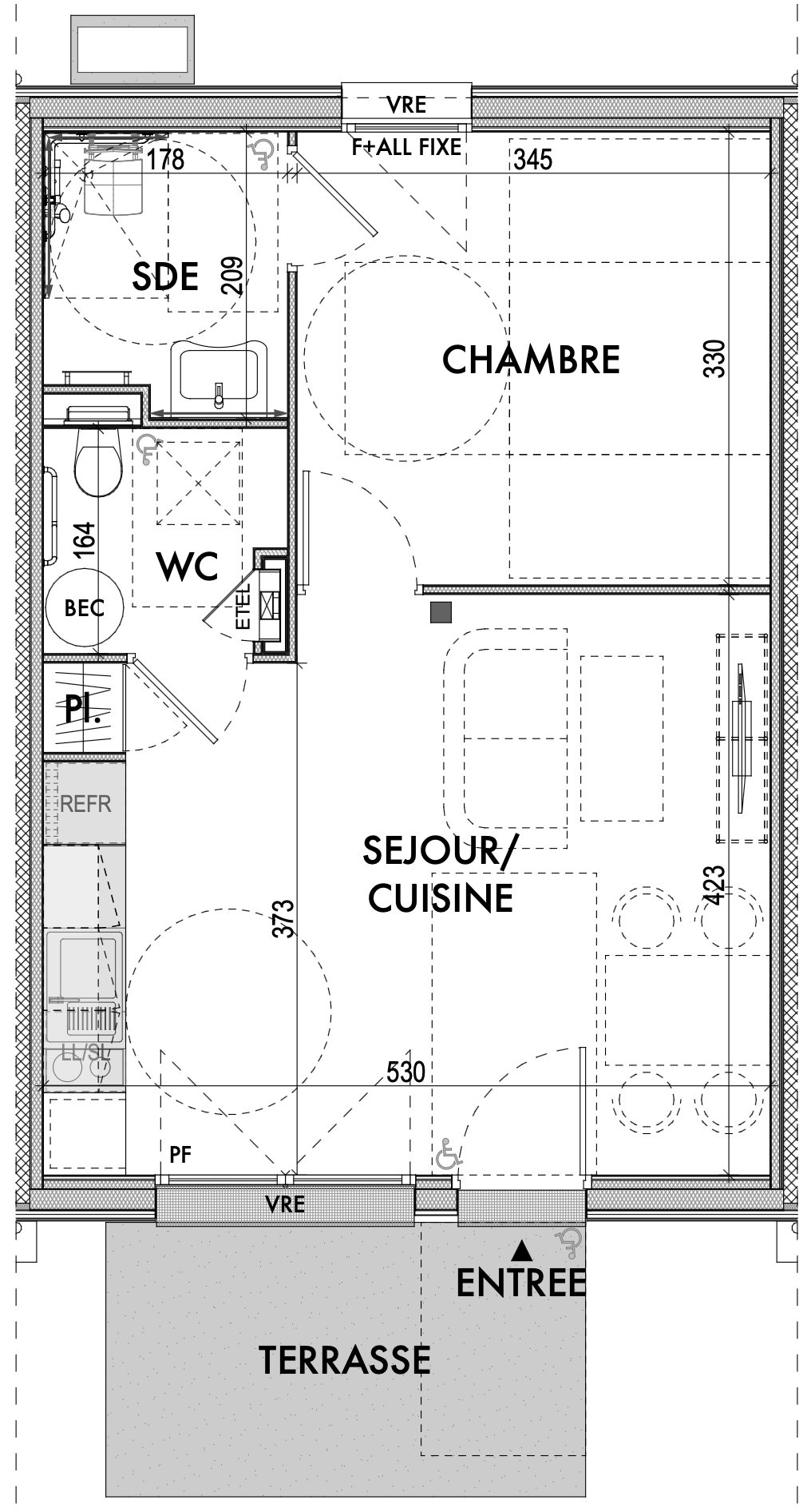 Cette Maison T2 est livrée équipée (sauf cuisine en option) : peintures, salle de bains, sols.