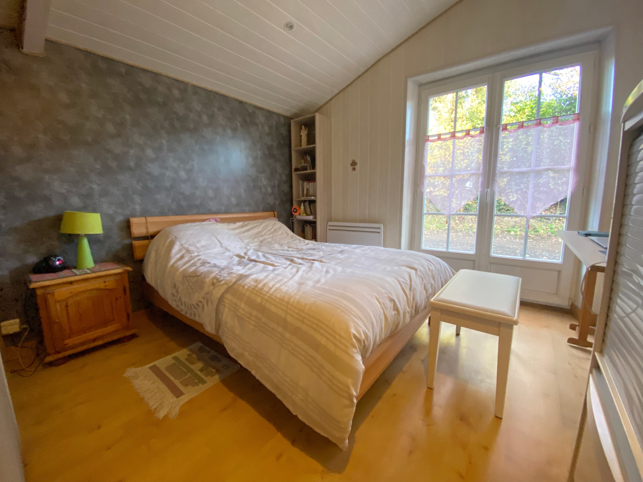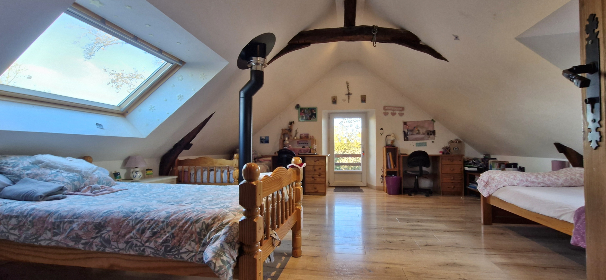 La maison confortable de 130 m2 habitables, 4 chambres, est équipée pour une autonomie énergétique complète (bois, panneaux solaires...).