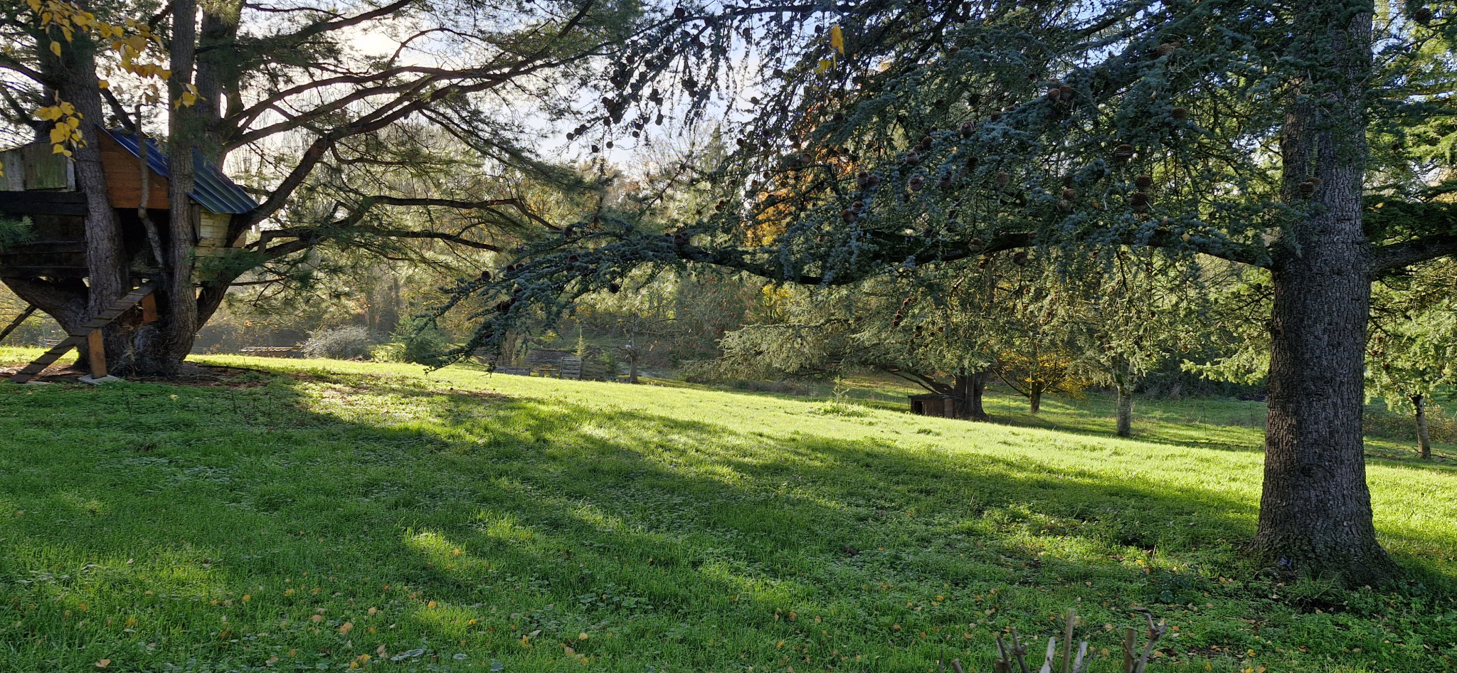 Le terrain, doté de puits, a été aménagé et offre différents espaces entièrement irrigués : parc, prairies, maraichage, vergers, deux grandes mares.