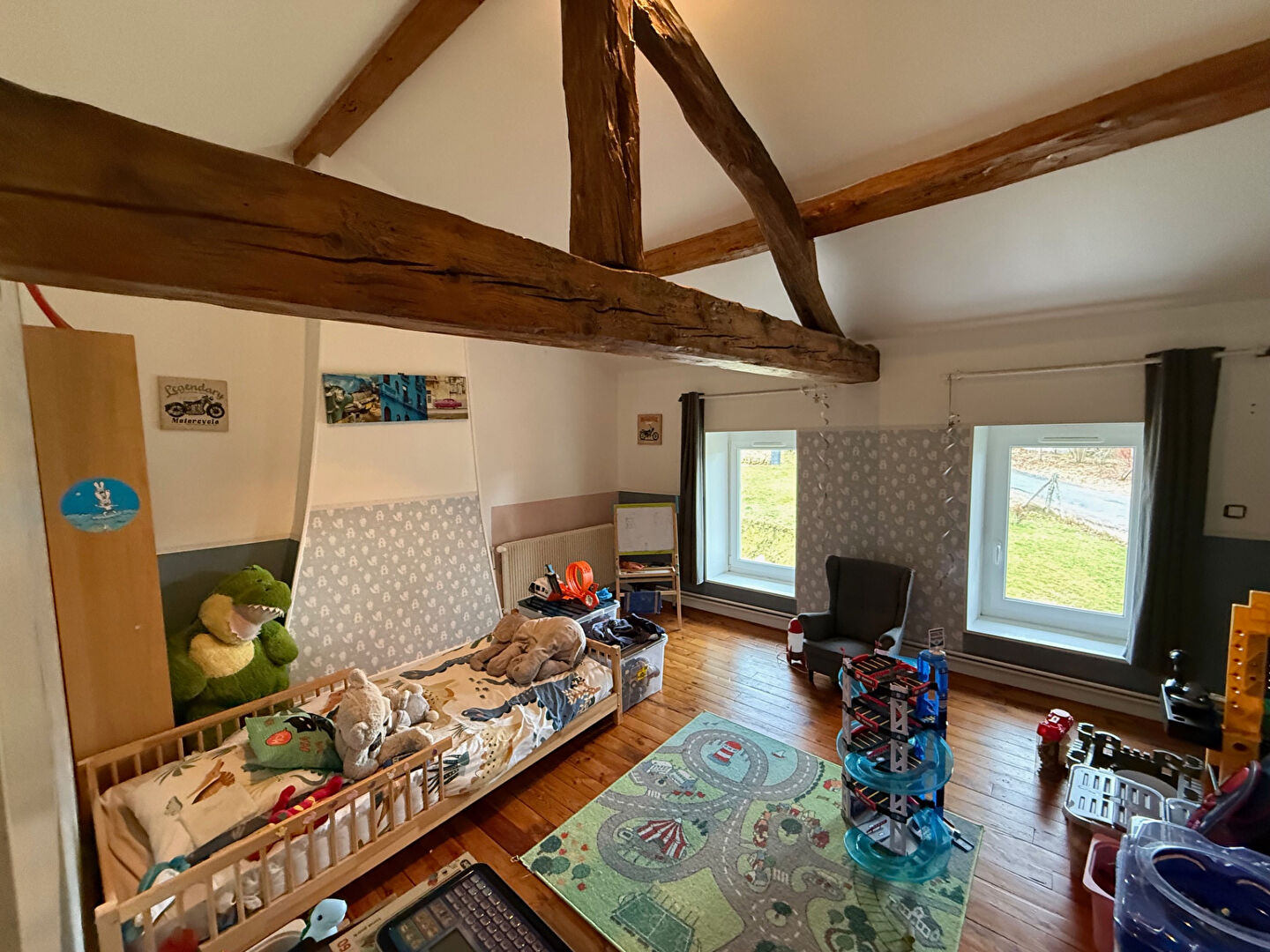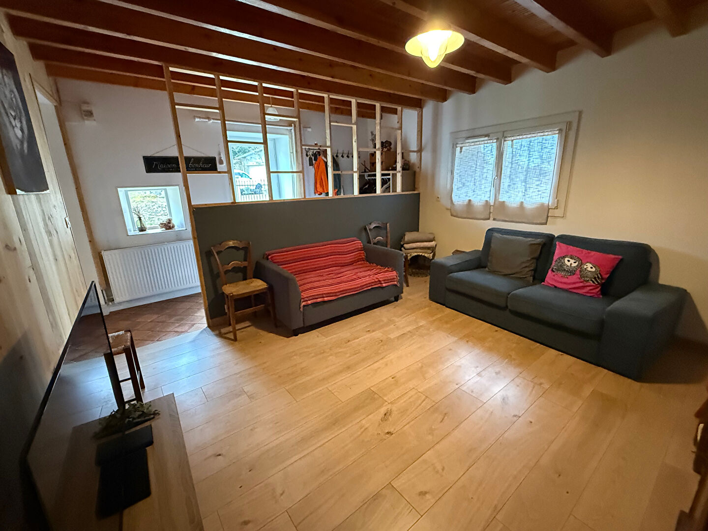 Chauffage central avec pompe à chaleur air / eau couplée à une chaudière à granulés, menuiseries en PVC double vitrage, toiture refaite à neuf en 2000, fosse septique.