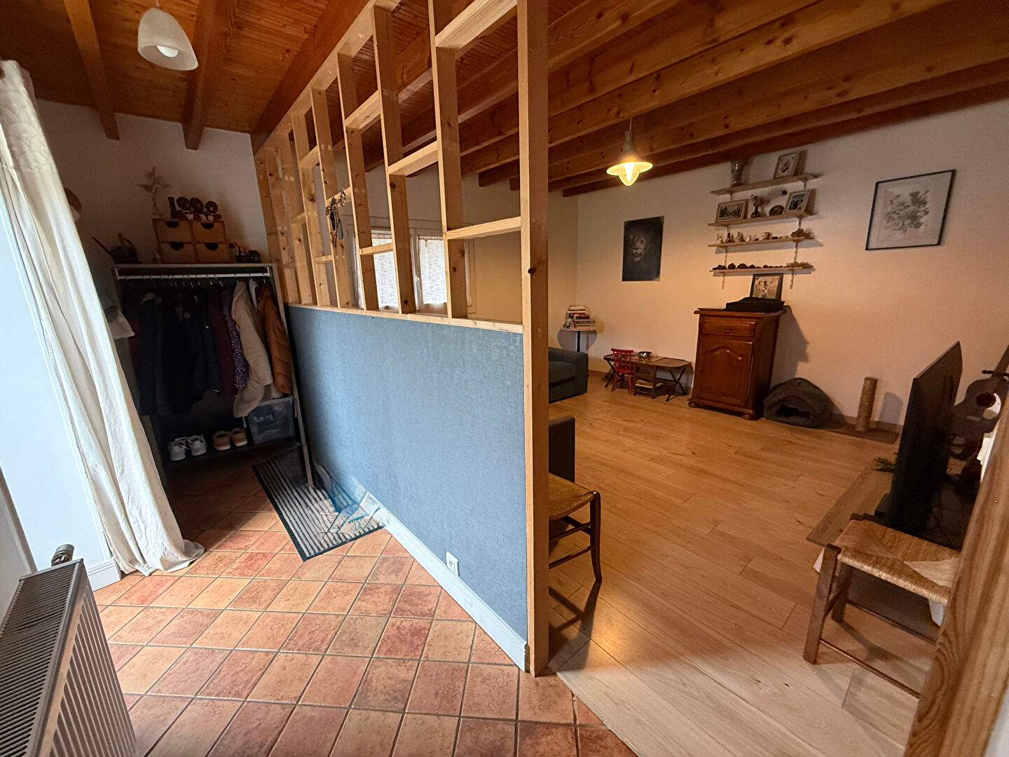 Maison en pierre rénovée pleine de charme dans un secteur paisible mais non isolé, au rez-de-chaussée : entrée, salon, cuisine / salle à manger avec cuisinière à bois, bureau, salle d'eau, W.C., buanderie et chaufferie ; à l'étage dégagement menant à deux grandes chambres, couloir avec rangements, suite parentale avec baignoire et lavabo, W.C. avec lave mains.