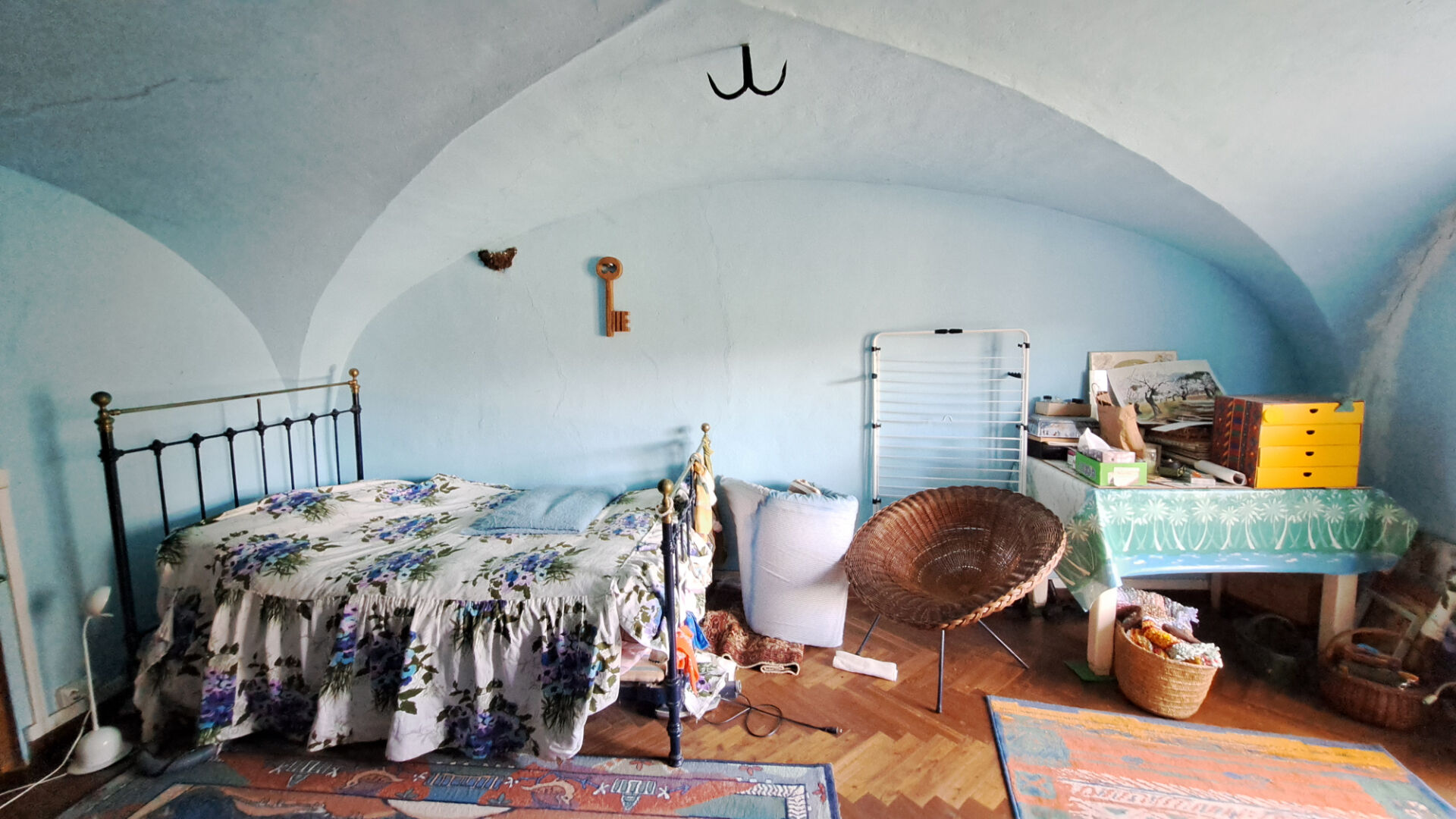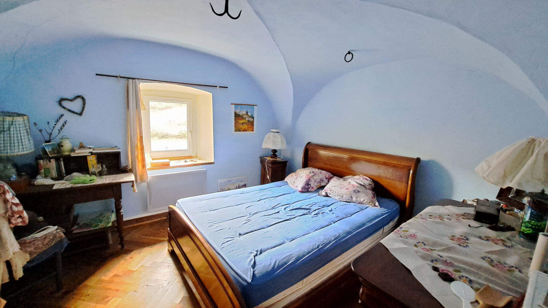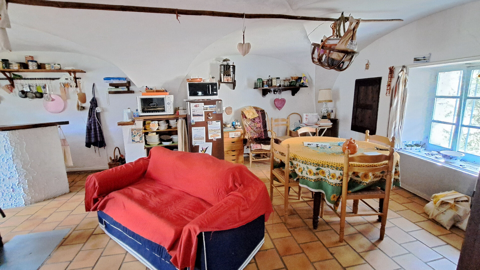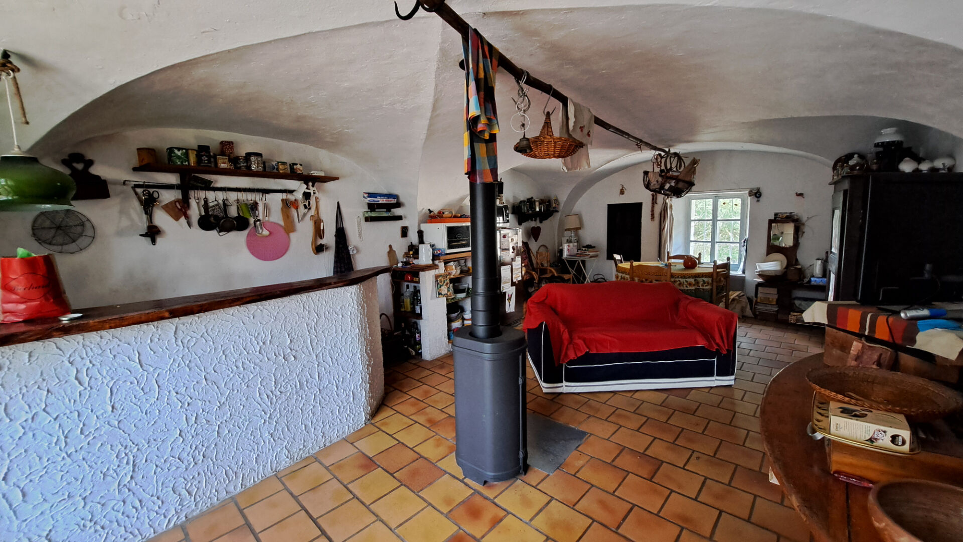 Un accès extérieur mène à une grande chambre type dortoir. En sous-sol : atelier, une pièce, écurie voûtée avec cave en terre battue.