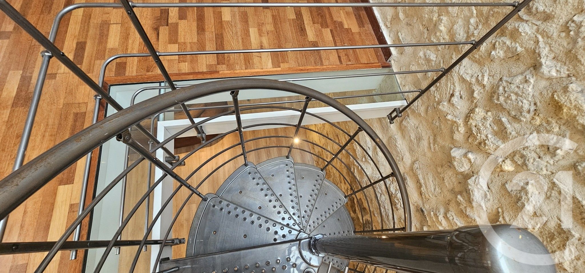 À l'étage, coup de c½ur assuré pour le superbe escalier en colimaçon métallique avec dalle vitrée, menant à une grande chambre lumineuse offrant un fort potentiel d'aménagement (possibilité de créer plusieurs chambres). Une salle d'eau moderne et fonctionnelle avec douche à bac plat, double vasque, WC et bidet, alliant confort et esthétisme. Les pierres apparentes et poutres renforcent l'esprit chic et authentique du lieu.