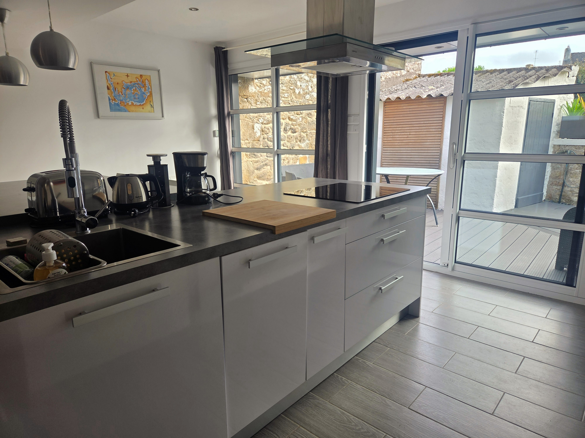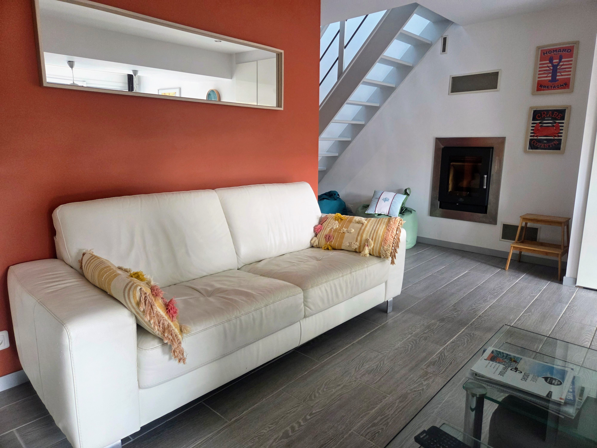 Au calme d'un petit hameau recherché au plus près de Larmor-Baden, et à 3mn à pied de la plage de sable de Locmiquel sur le Golfe du Morbihan. Idéal pied à terre en Bretagne : adorable maison de pêcheur rénovée et ses deux terrasses, dans une impasse, Maison ancienne en pierre exposée plein sud, très bien équipée et en excellent état, offrant de plain pied : une grande pièce à vivre ouvrant par une double baie vitrée sur la cour-terrasse aménagée, véritable pièce de vie à l'abri des regards. Cuisine ouverte aménagée-équipée, espace déjeuner, salon avec poêle à bois. De plain pied une grande salle d'eau double vasque + toilettes. Buanderie chaufferie. À l'étage : palier, deux vraies chambres : l'une avec placard penderie, ouvrant sur une grande terrasse aménagée, l'autre avec une mezzanine et son escalier en métal sur mesure (couchage supplémentaire). Toilettes avec lave-mains ; possibilité douche. Rénovation récente de qualité, bardage zinc, huisseries double vitrage, carrelage. Chauffage électrique.DPE : D ; GES : B