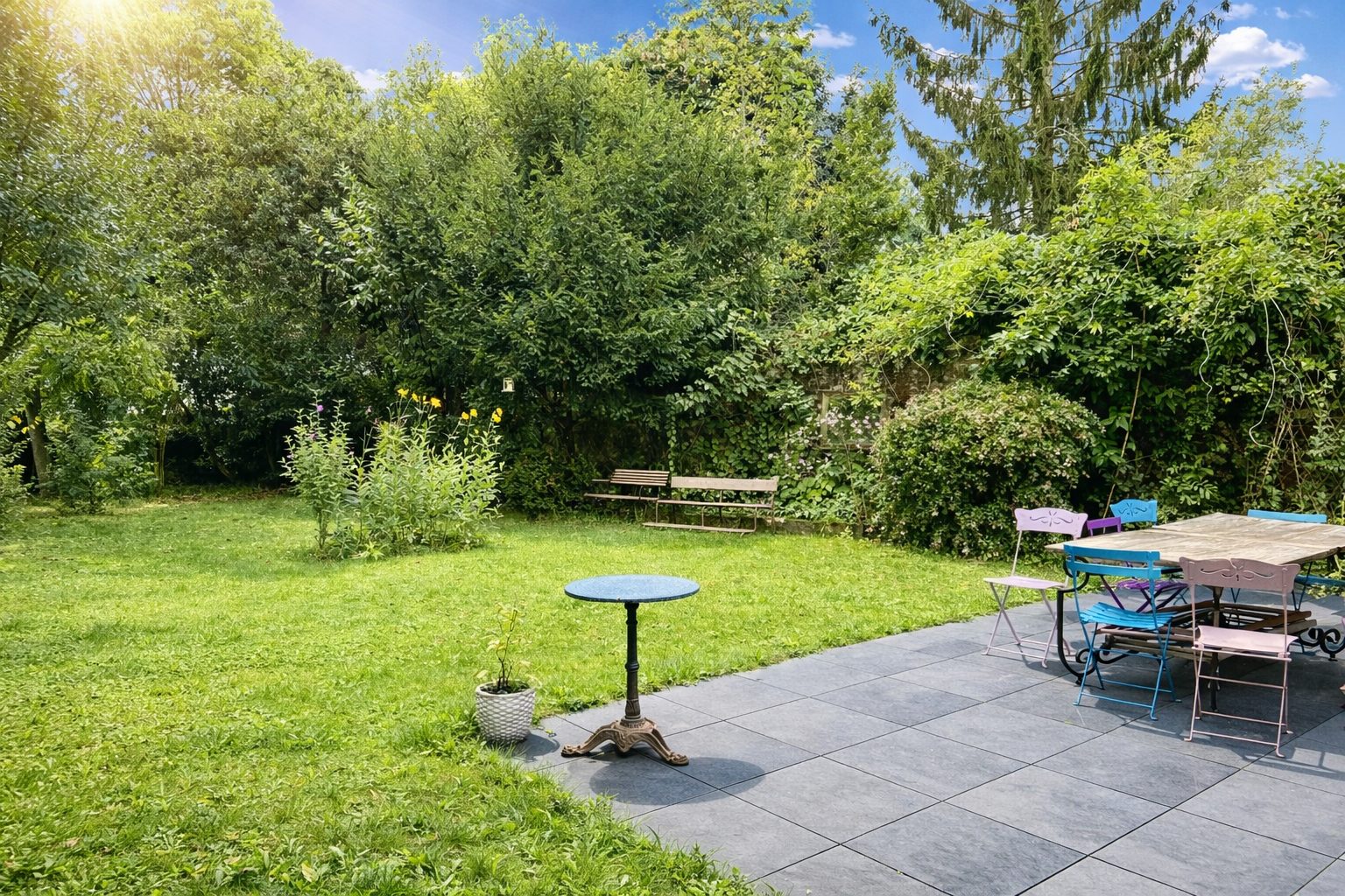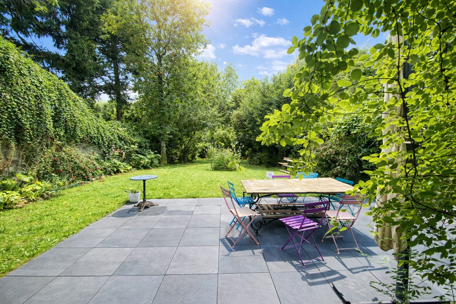 Entièrement rénovée, le séjour baigné de lumière offre une belle hauteur sous plafond et est prolongé par de larges baies vitrées ouvrant sur une terrasse intimiste exposée sud-ouest. Rare en ville, le jardin arboré de plus de 500 m² offre un véritable écrin de verdure à l'abri des regards.