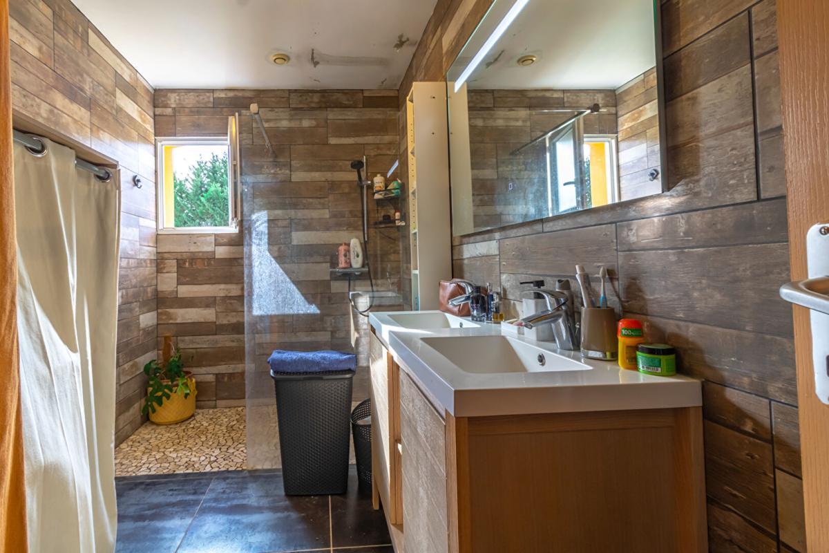 _ Maison composée au rez-de-chaussée : Salon séjour avec cuisine ouverte équipée aménagée et son poêle a granule, ( conduit de cheminée ) 2 chambres, salle d' eau, wc .