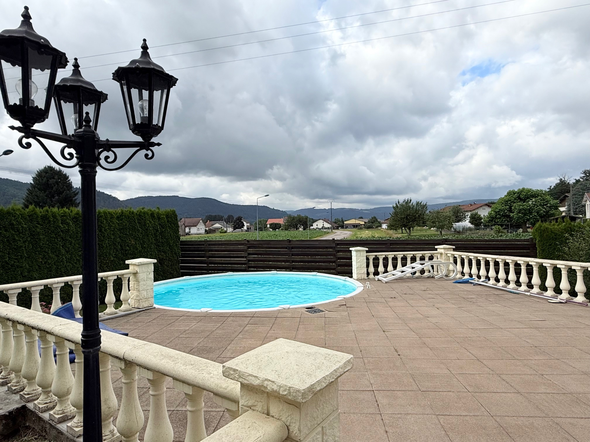 Entrée, cuisine équipée ouverte sur salon-séjour (poêle à pellets) accès terrasse dallée et piscine. Wc