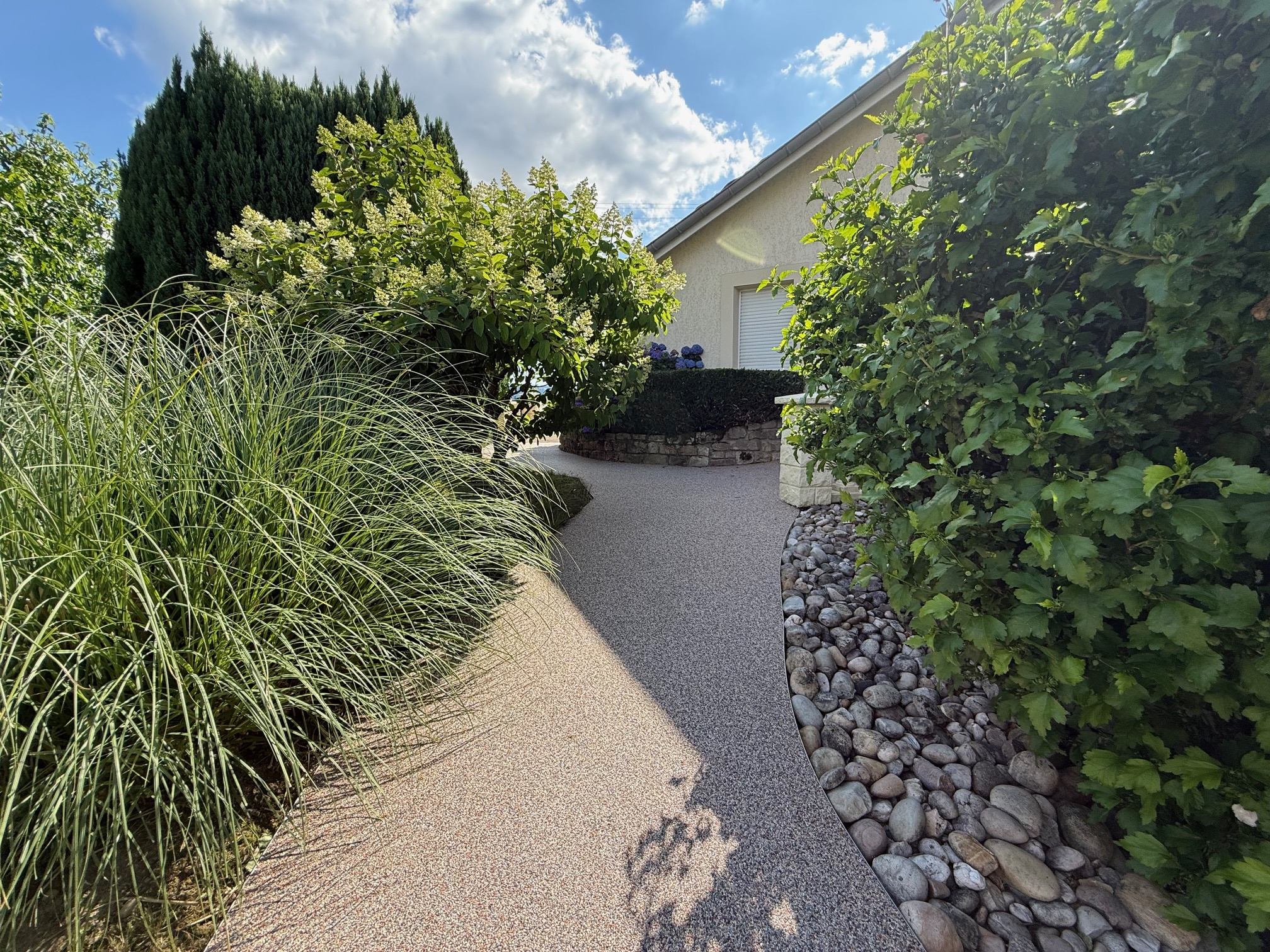 Terrain paysagé d'environ 1 349 m2 avec piscine. Cour macadam et résine.