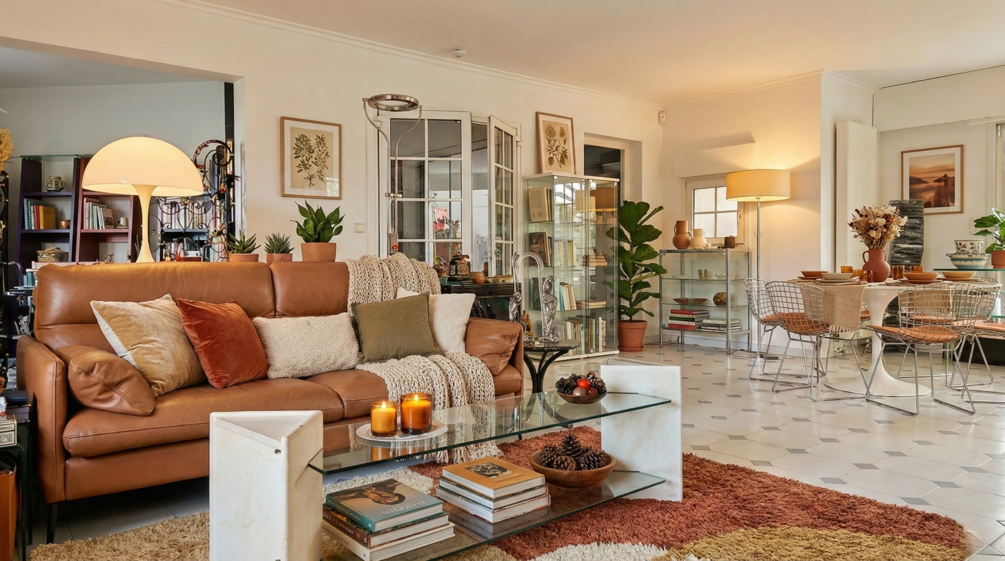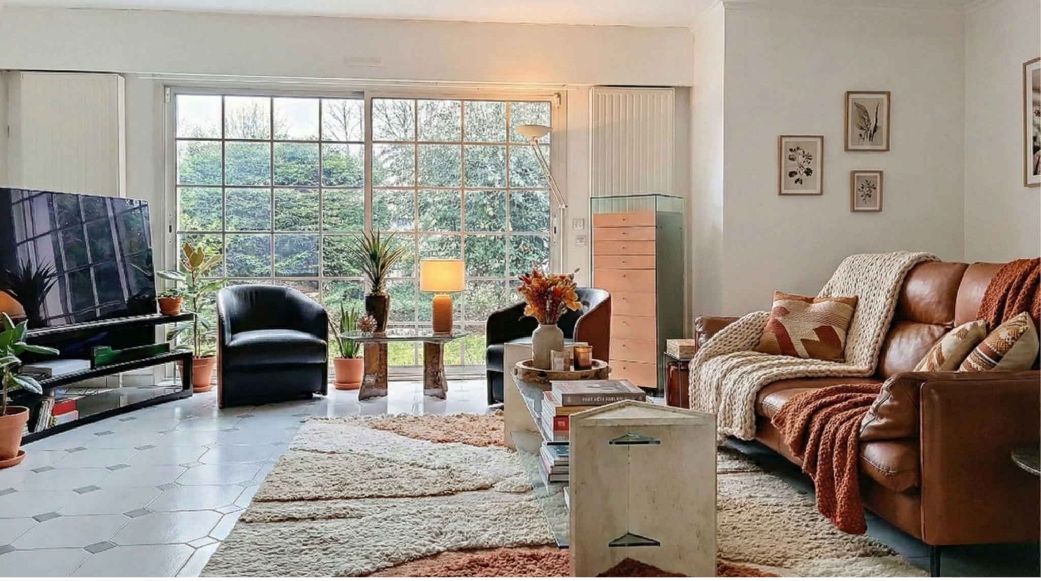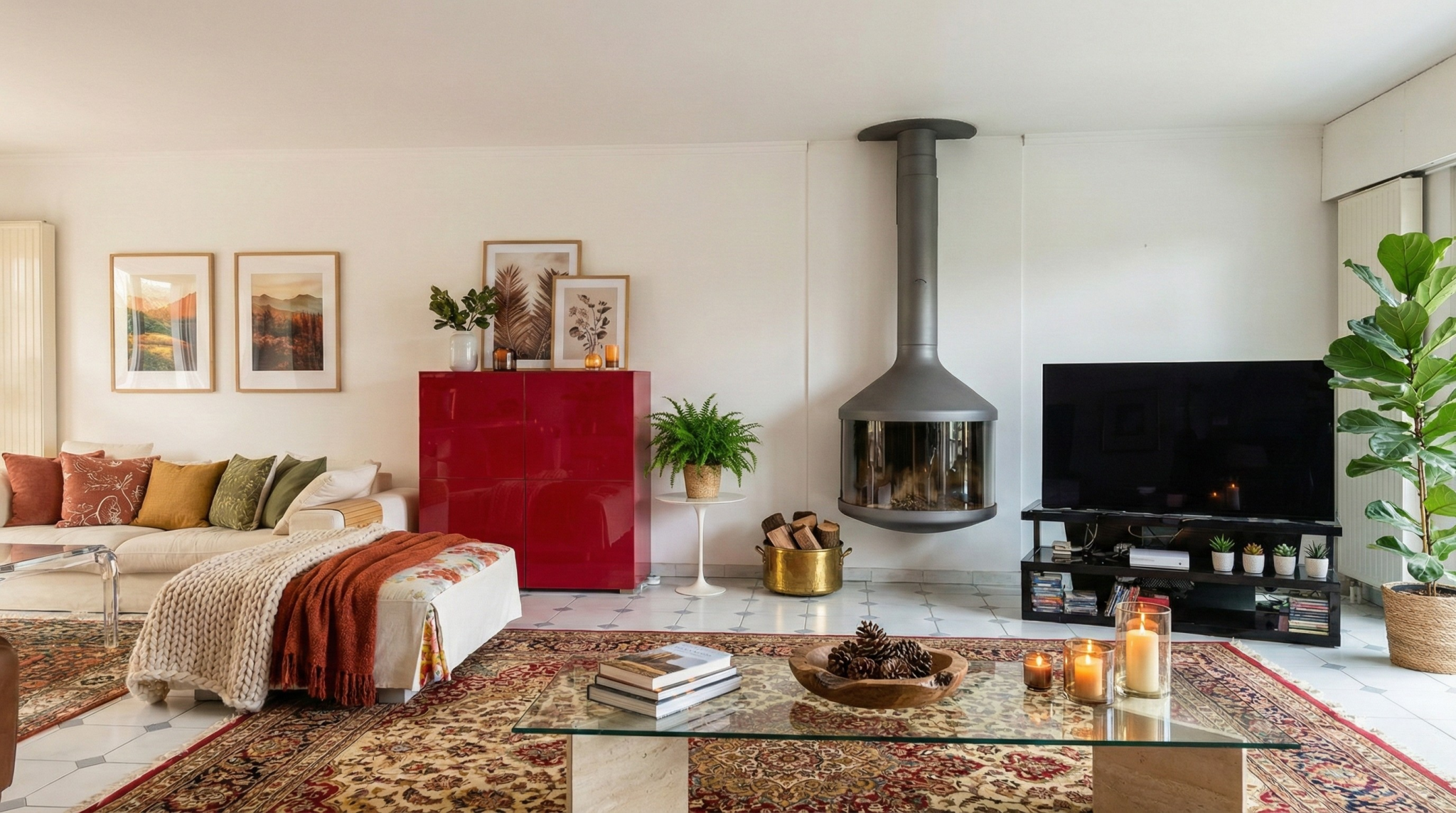 Un double séjour/ salle à manger traversant de 60 m2 baigné de lumière, avec cheminée Focus suspendue récente,