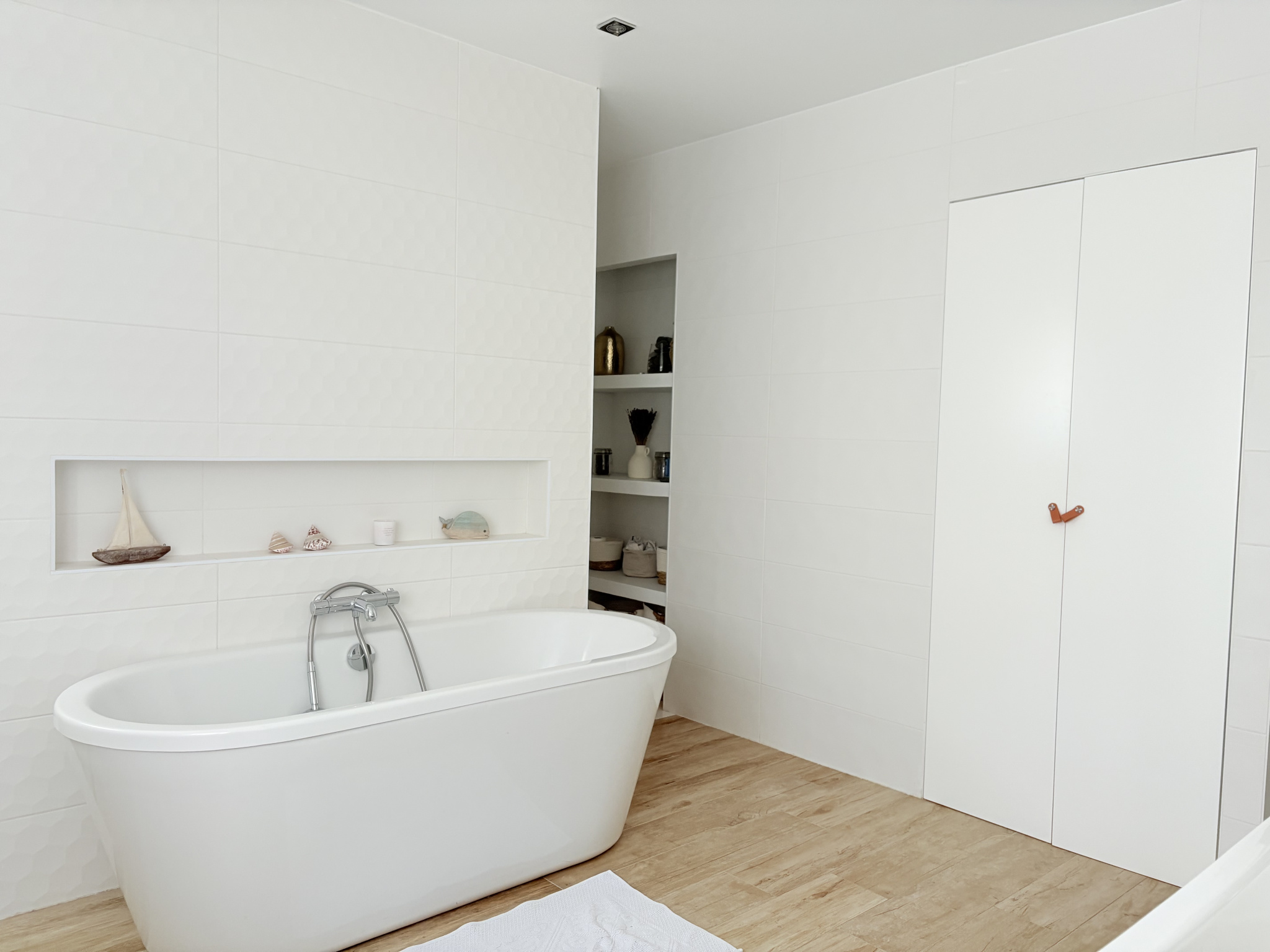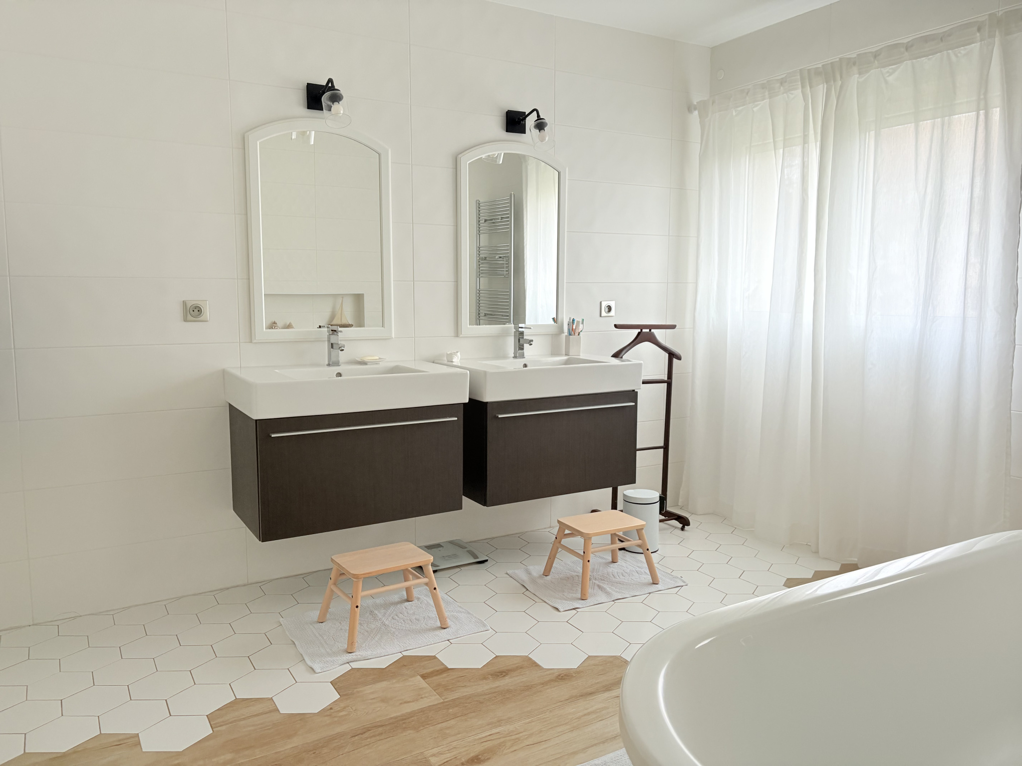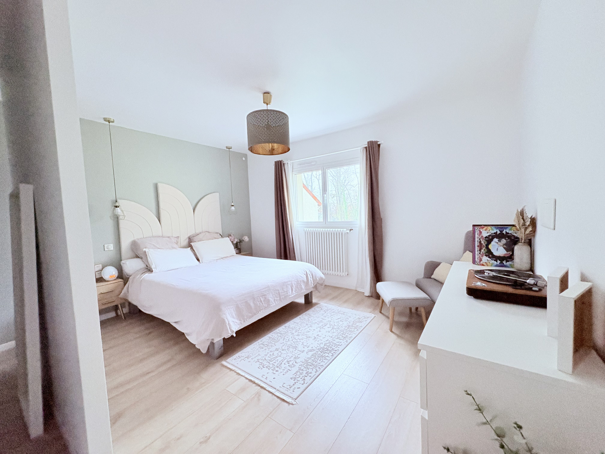 À l'étage, un beau palier dessert trois belles chambres (14,14,5 et 18m2), dont une parentale avec grand dressing, ainsi qu'une spacieuse salle de bains (baignoire et douche) avec WC.