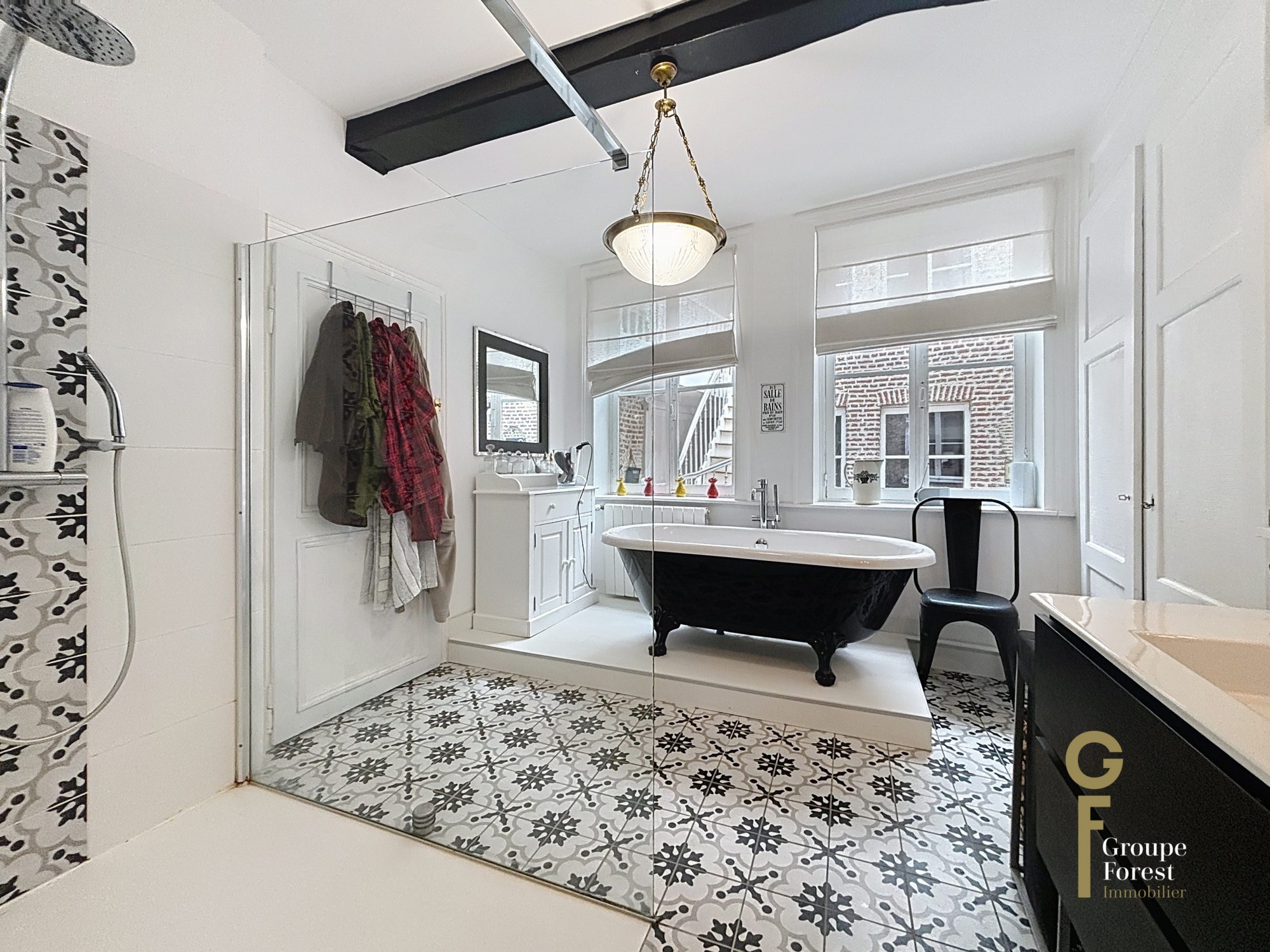Nichée au coeur du Vieux-Lille, dans une adresse aussi calme que recherchée, cette maison typique séduit par son cachet authentique et son atmosphère résolument chaleureuse.Briques apparentes, ambiance chaleureuse avec cheminée, volumes généreux et hauteurs sous plafond composent un élégant salon de 40 m², prolongé par une spectaculaire salle à manger de 25 m² sous verrière, véritable puits de lumière de 9,3 mètres.La cuisine, ouverte sur cet espace, profite de la même perspective et d'une belle convivialité.