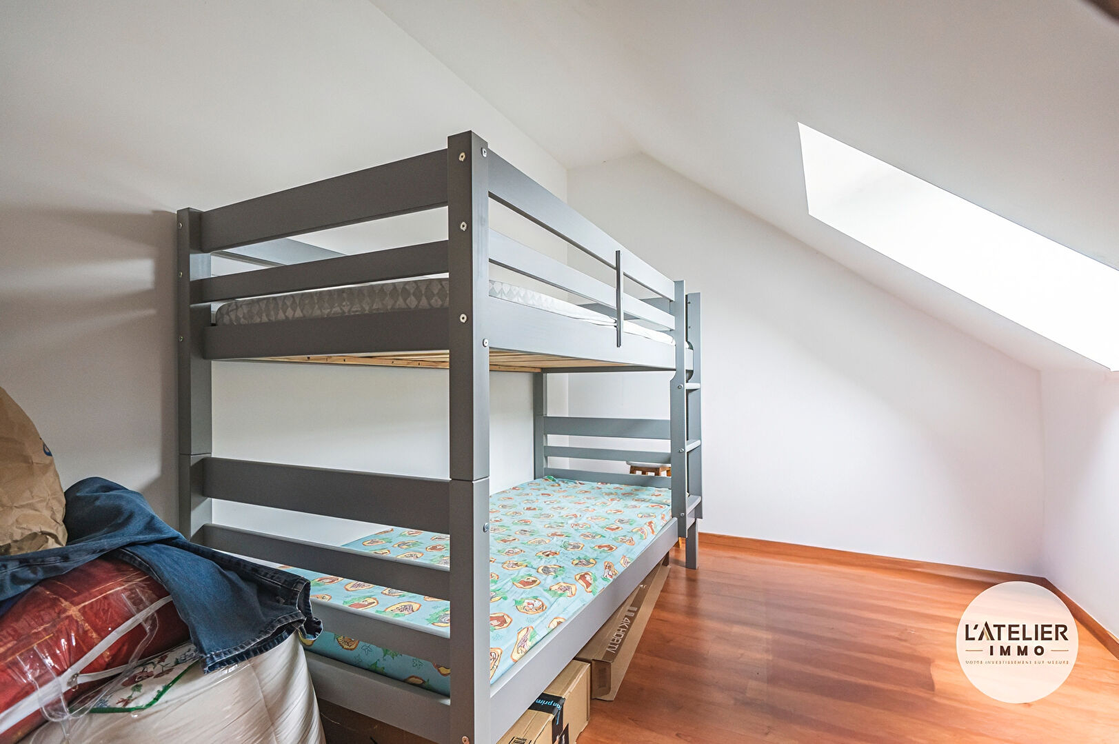 Un duplex avec pièce de vie, deux chambres, salle d'eau et box extérieur.