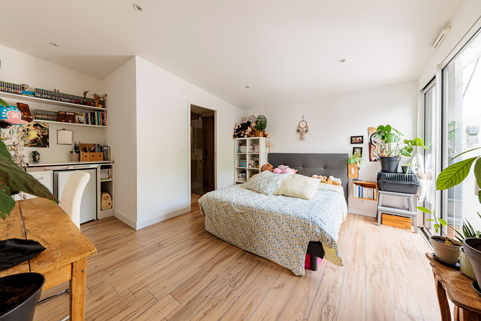 Entrée avec placards, vaste réception avec cuisine équipée de plain-pied sur terrasse et jardin sud sans vis-à-vis, 2 suites parentales avec dressing et salle d'eau, lingerie et deux WC. Douche extérieure.