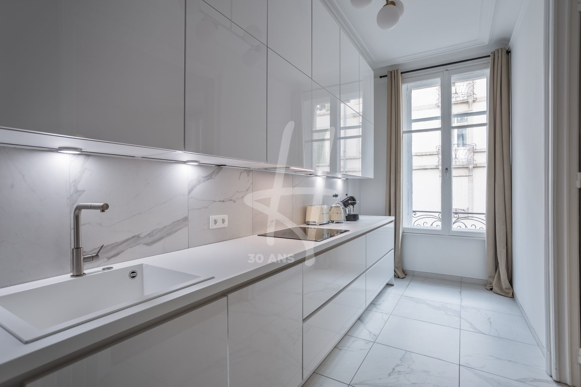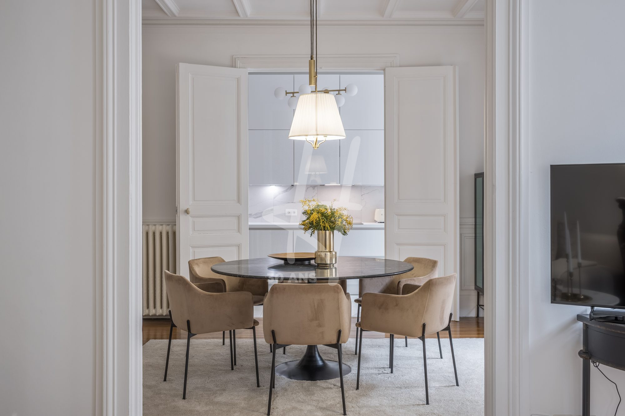 Il se compose, d'un grand dégagement desservant un séjour ouvert sur une cuisine rénovée, entièrement équipée (électroménager complet), d'un salon élégant avec une magnifique cheminée en marbre, de trois chambres, ainsi que d'une salle de bain récemment rénovée, avec douche à l'italienne.