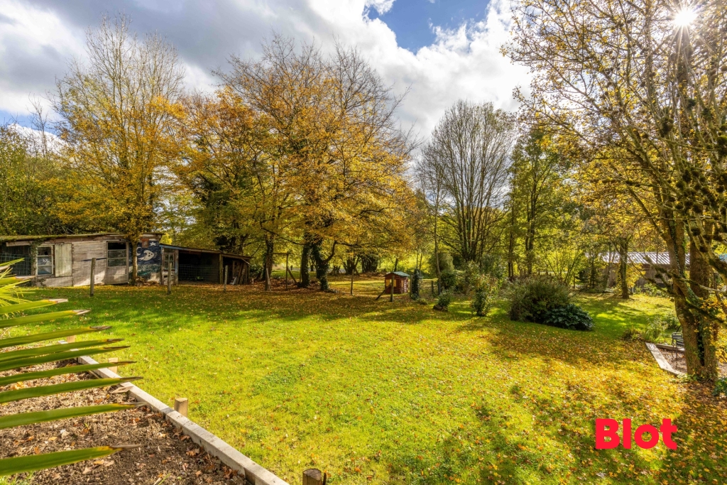 À l'extérieur, vous profiterez d'une agréable terrasse en bois ouvrant sur un jardin de 3000 m² arboré et de 5000 m² en pâturage, un véritable havre de paix à seulement 2 minutes du bourg.