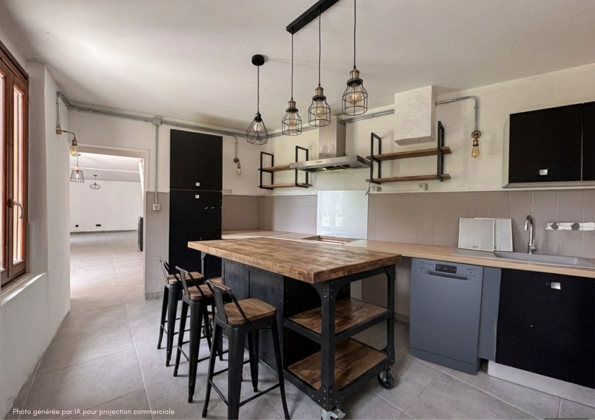 Une cuisine séparée de 12,7 m2, équipée d'une hotte à filtration et d'une VMC.