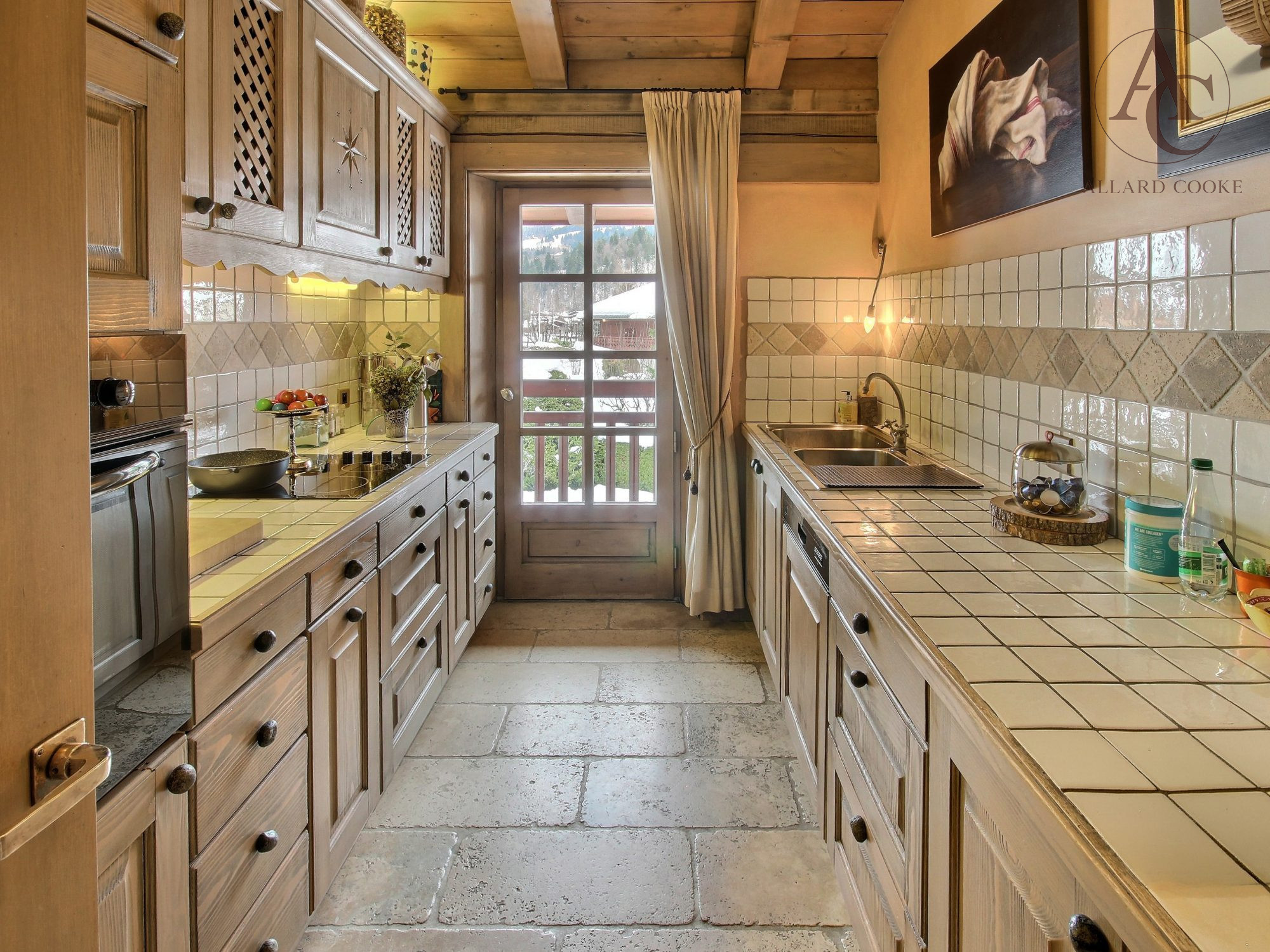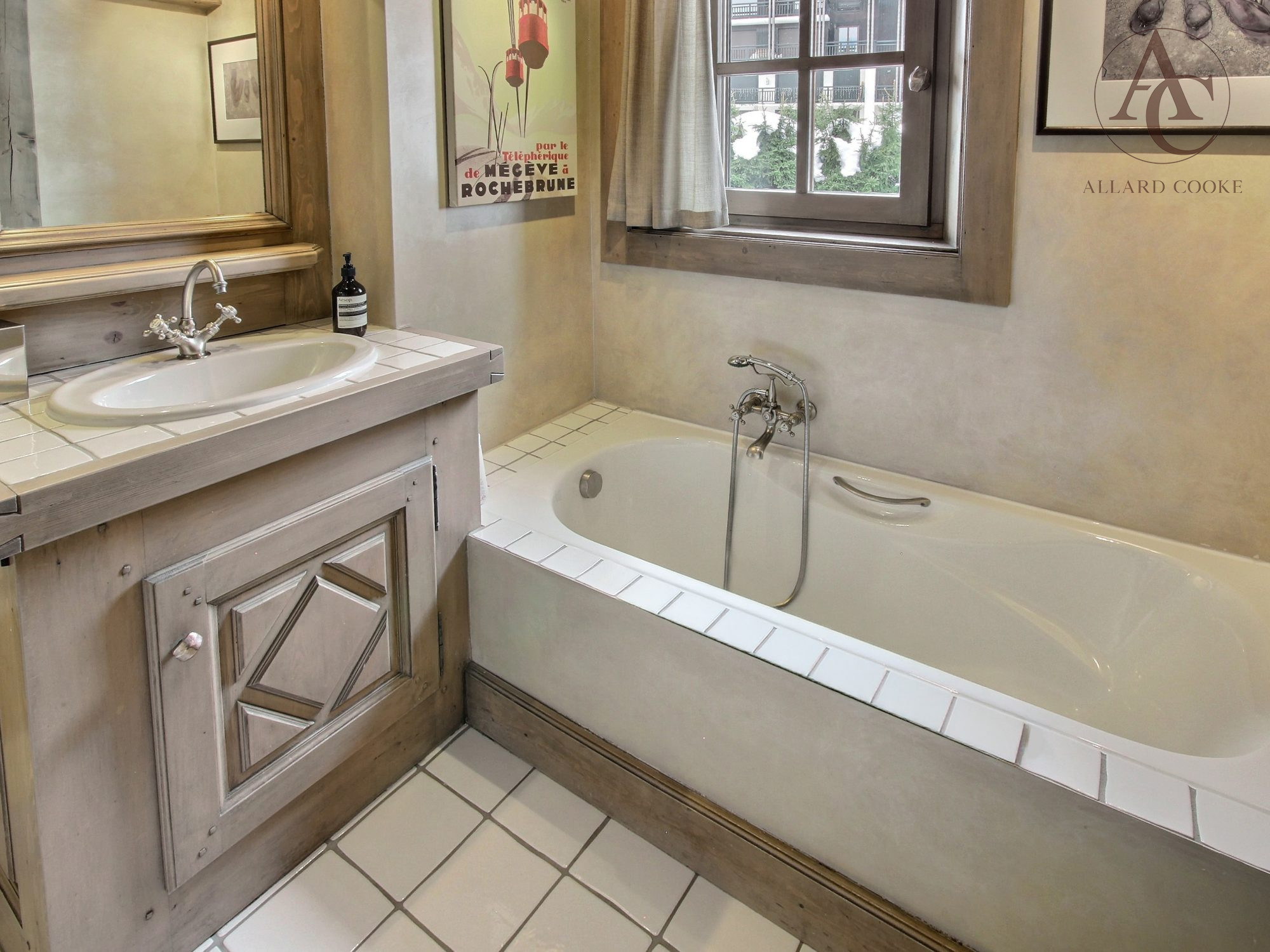 une entrée avec vestiaire et dégagement, une buanderie, des wc invités, une cuisine indépendante parfaitement équipée, un salon avec cheminée et un séjour, le tout prolongé par un grand balcon exposé Sud offrant une vue dégagée sur les massifs du Mont-d'Arbois, Rochebrune et Côte 2000 ; au même niveau, une chambre avec salle de bains.