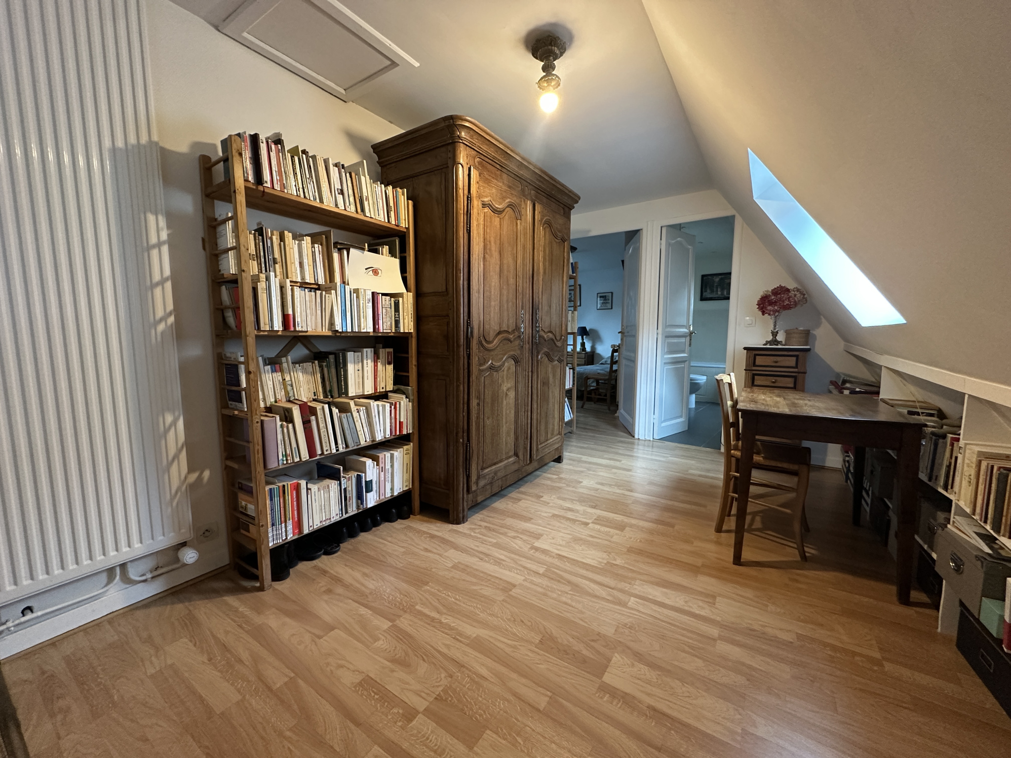 Étage mansardé (62 m2 au sol) : Grand palier avec espace bureau. Deux chambres (13,37 m2 et 11,71 m2). Salle de bains (2010) et WC.