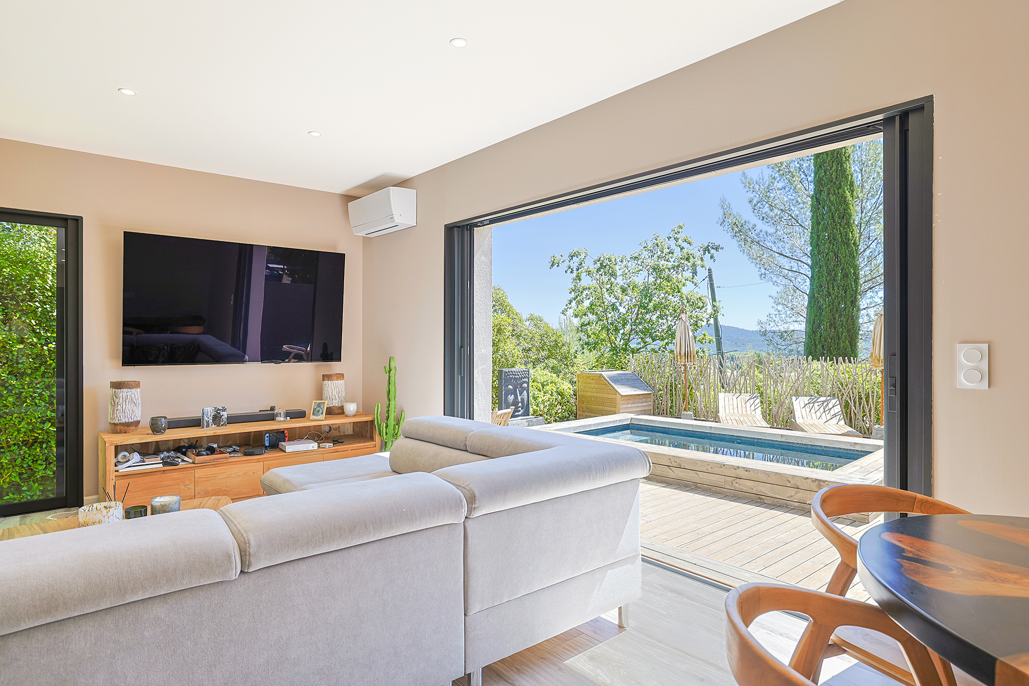 SOLLIES-PONT (SAINTE-CHRISTINE) : nous sommes fiers de vous présenter cette villa contemporaine T4 de 100m2 habitable, bâtie en 2022 sur un terrain de 796m2 en position dominante dans un secteur naturel, calme, sans vis-à-vis et avec une vue dégagée ! Elle se compose :