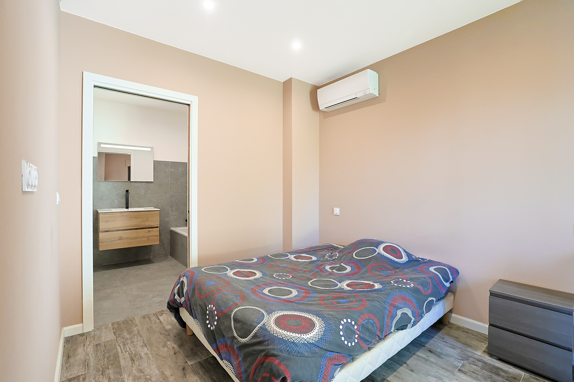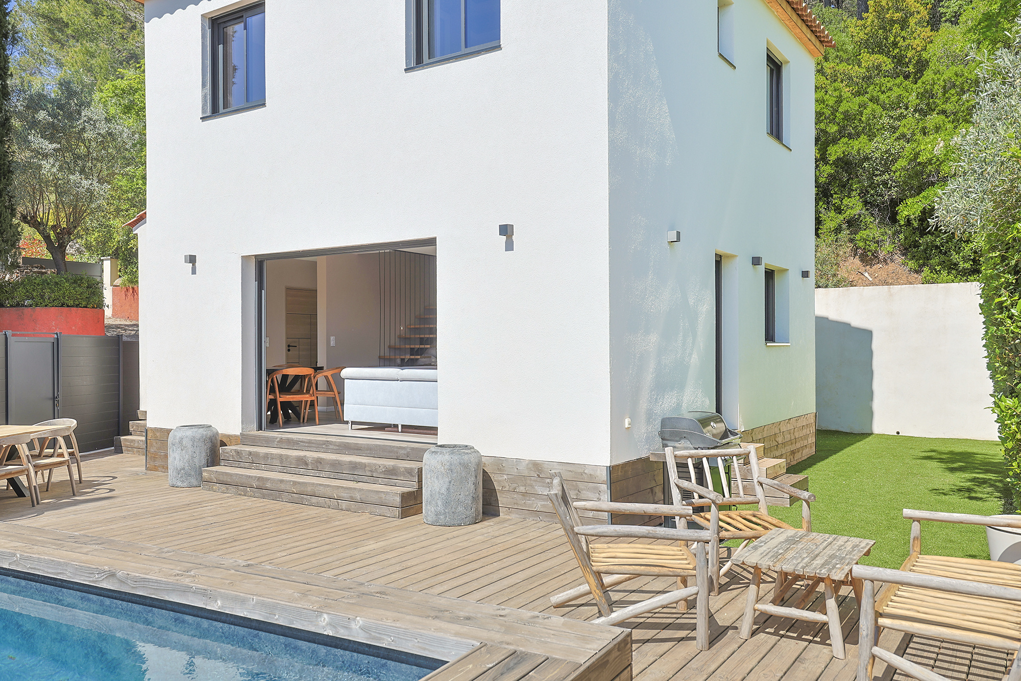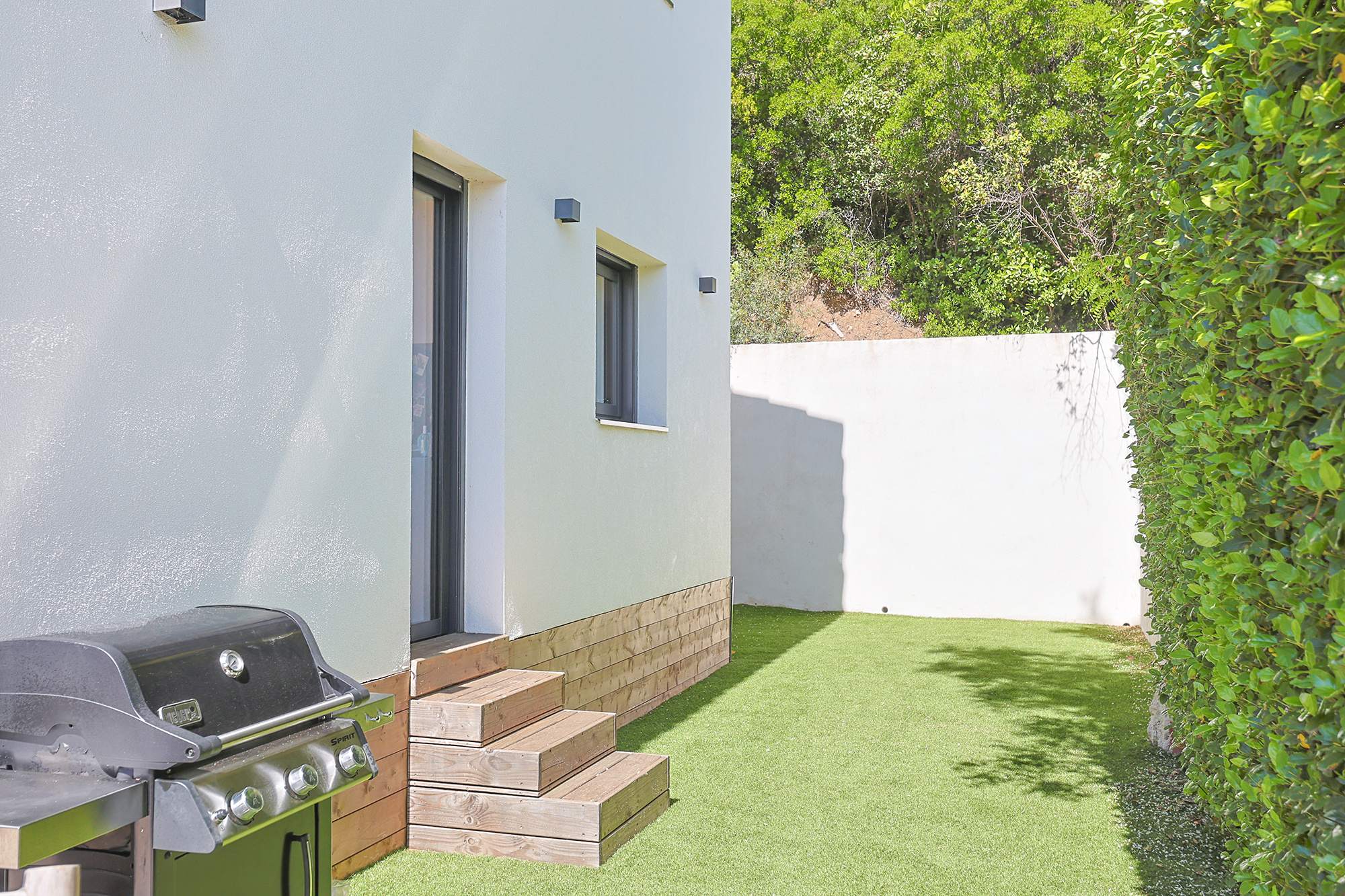 À l'extérieur, un terrain plat et clos, une piscine avec grande plage en bois tout autour et un espace gazon synthétique intime. En plus, la villa dispose d'un grand parking privatif extérieur du clos, pouvant accueillir au moins 6 voitures.