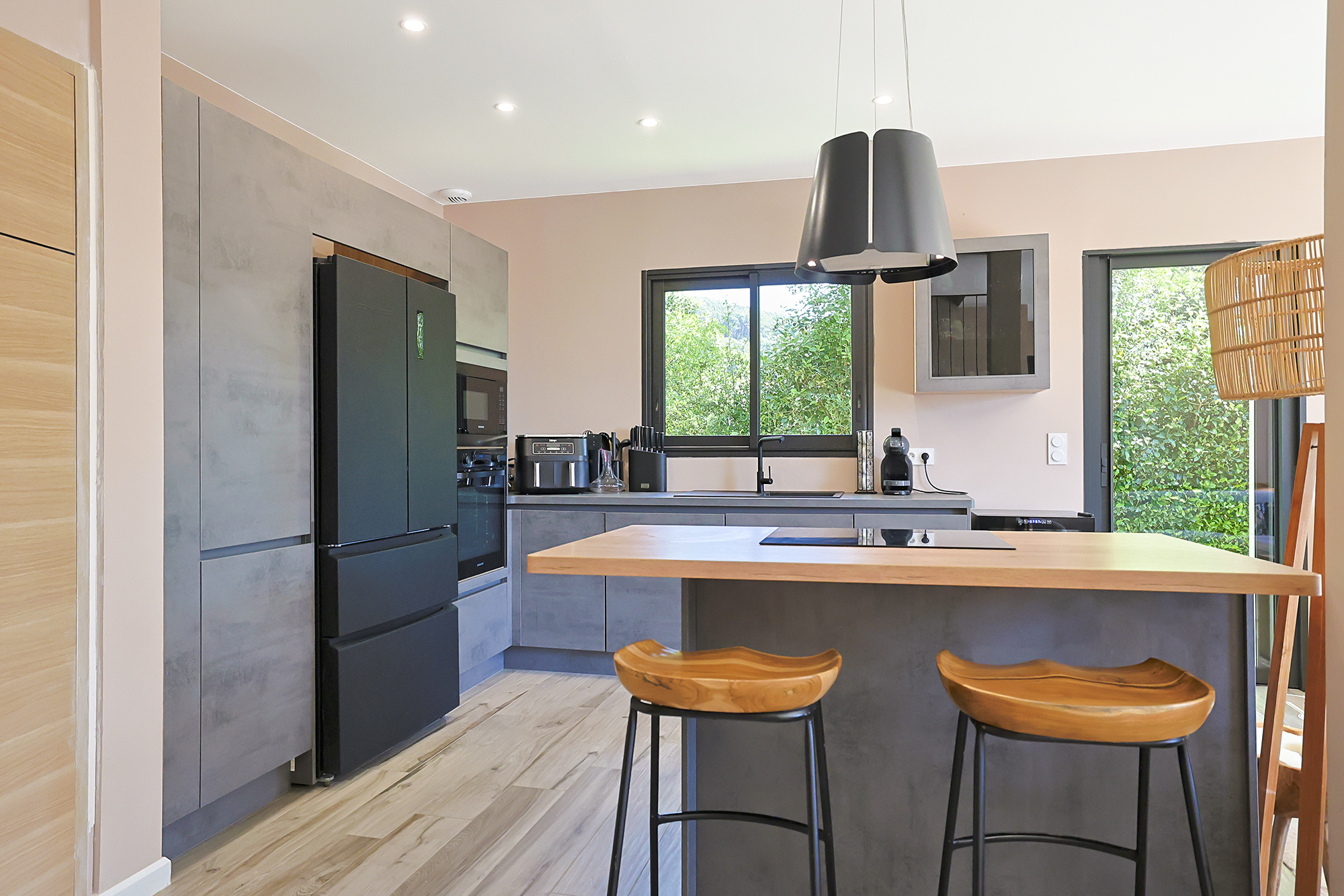 au rez-de-chaussée, d'un porche extérieur, d'une entrée, d'un séjour/cuisine US équipée avec baie vitrée à galandage donnant sur l'espace extérieur, d'une suite parentale avec salle de bains, d'une buanderie et d'un WC indépendant.