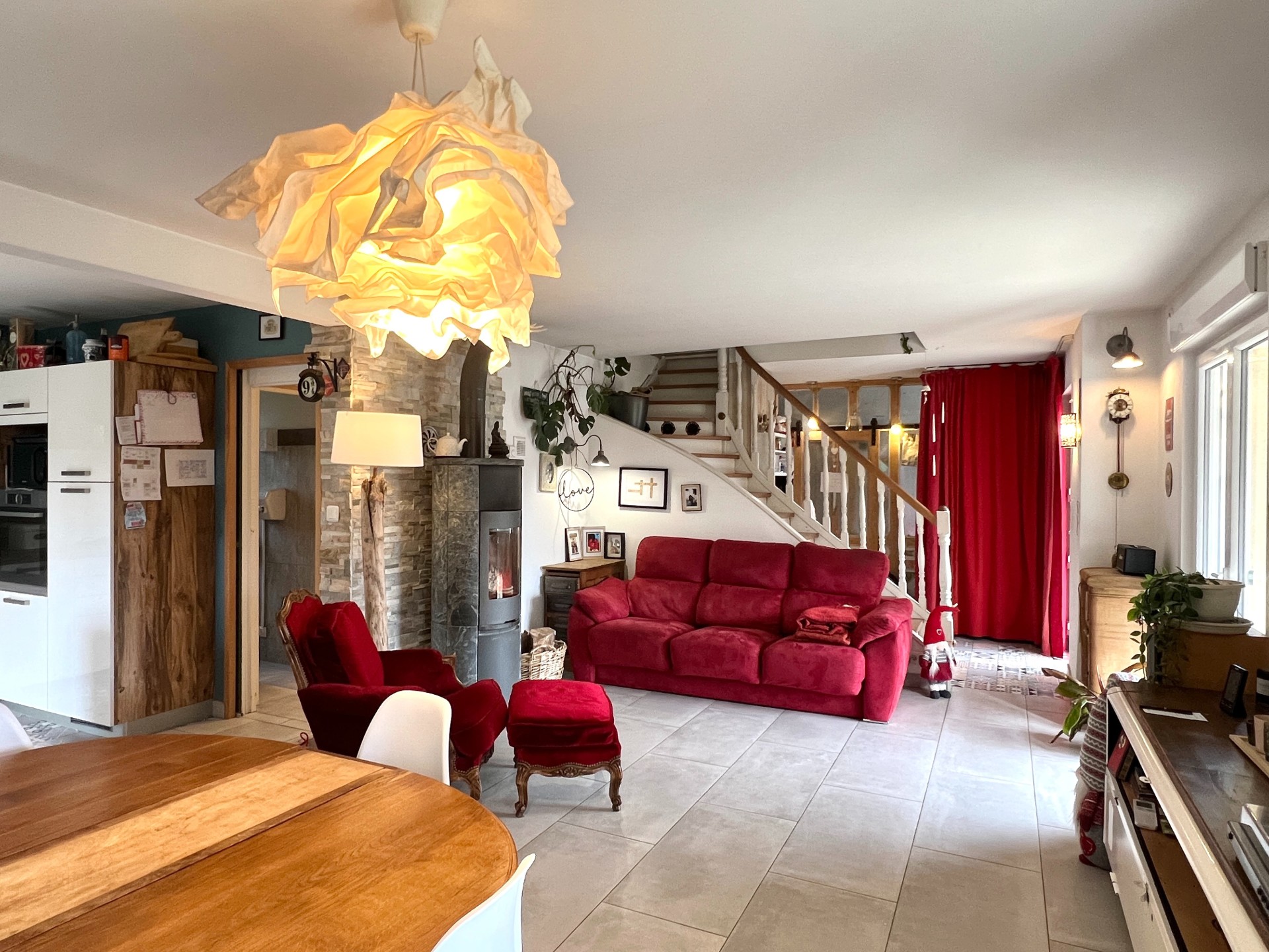 La pièce de vie de 38 m2 avec sa cuisine équipée ouverte, est chaleureuse et au goût du jour , sublimée par un poêle à bois et climatisation réversible offrant ainsi une atmosphère cosy et accueillante en toute saison , accès terrasse et jardin