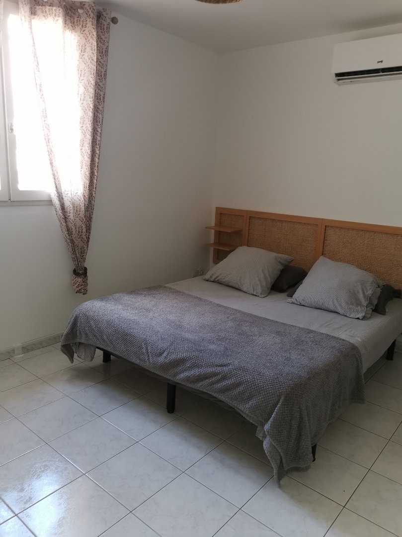 Sur 542 m2 de jardin, villa de plain pied comprenant cuisine aménagée donnant sur séjour salon, 2 chambres, suite parentale avec salle d'eau et placards, cellier, garage, climatisation.