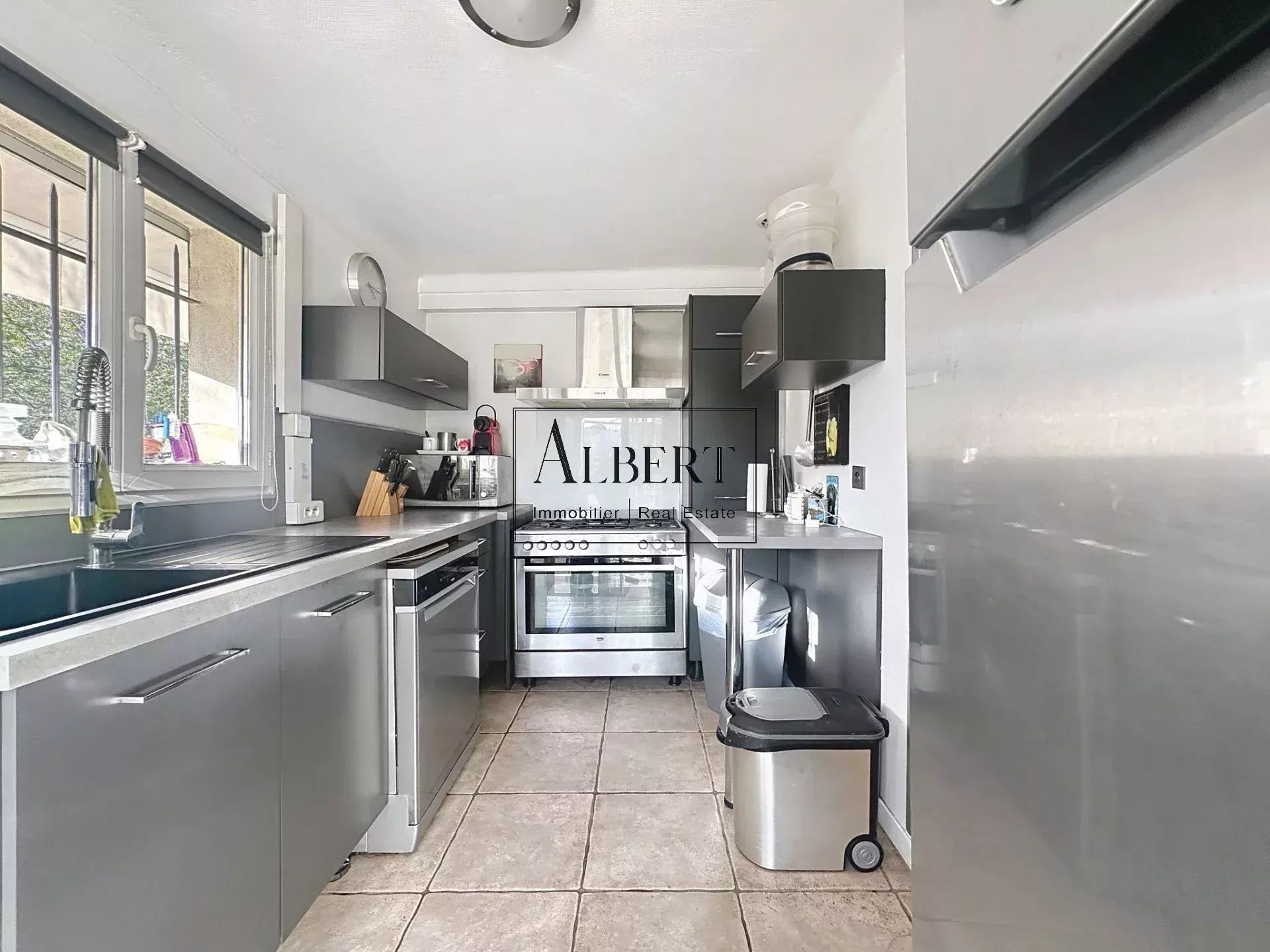 À l’intérieur, le logement propose un joli salon lumineux avec espace salle à manger, parfait pour accueillir famille et amis. La cuisine indépendante, décalée et entièrement équipée, offre un espace pratique pour cuisiner en toute convivialité.
