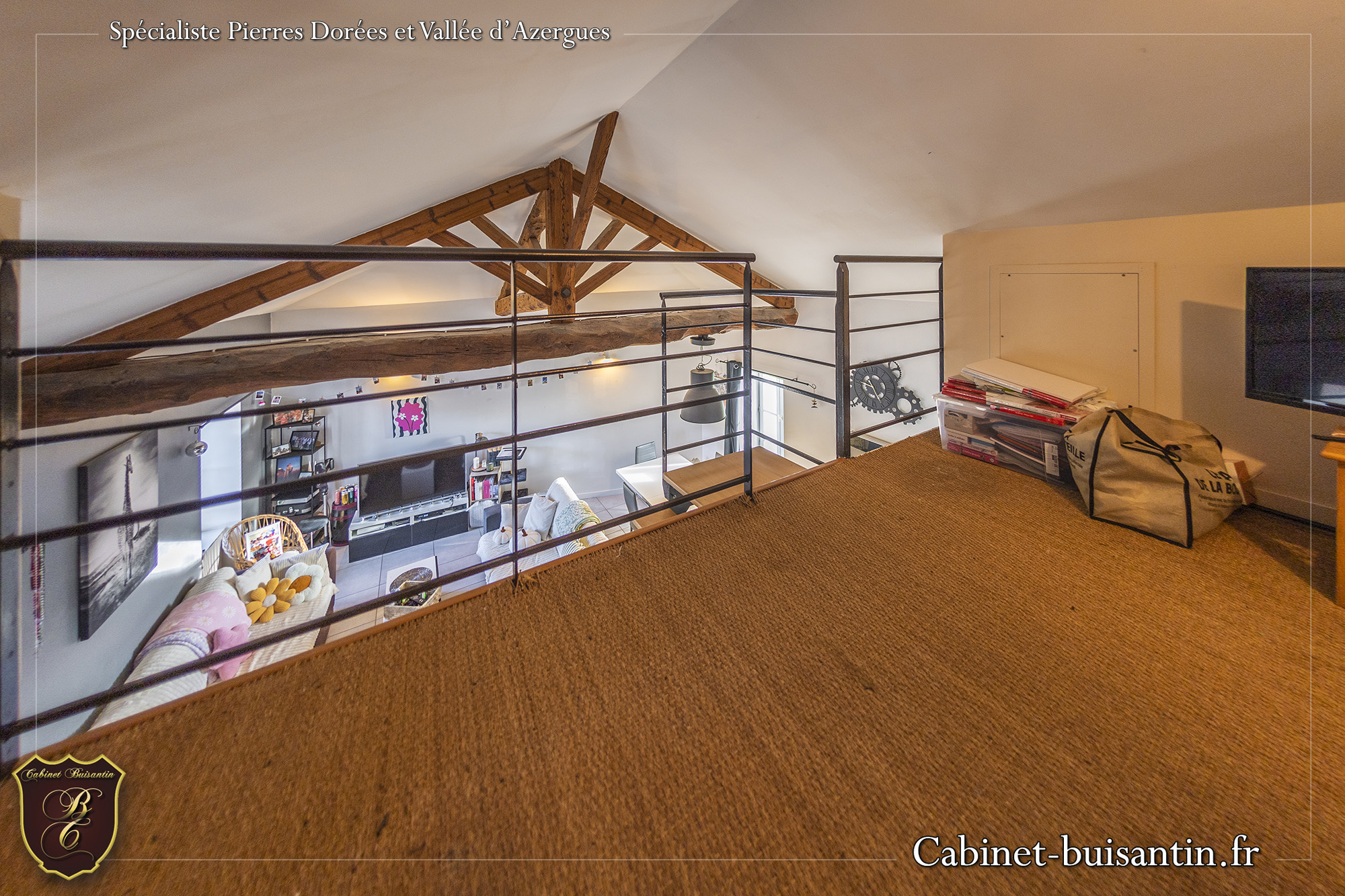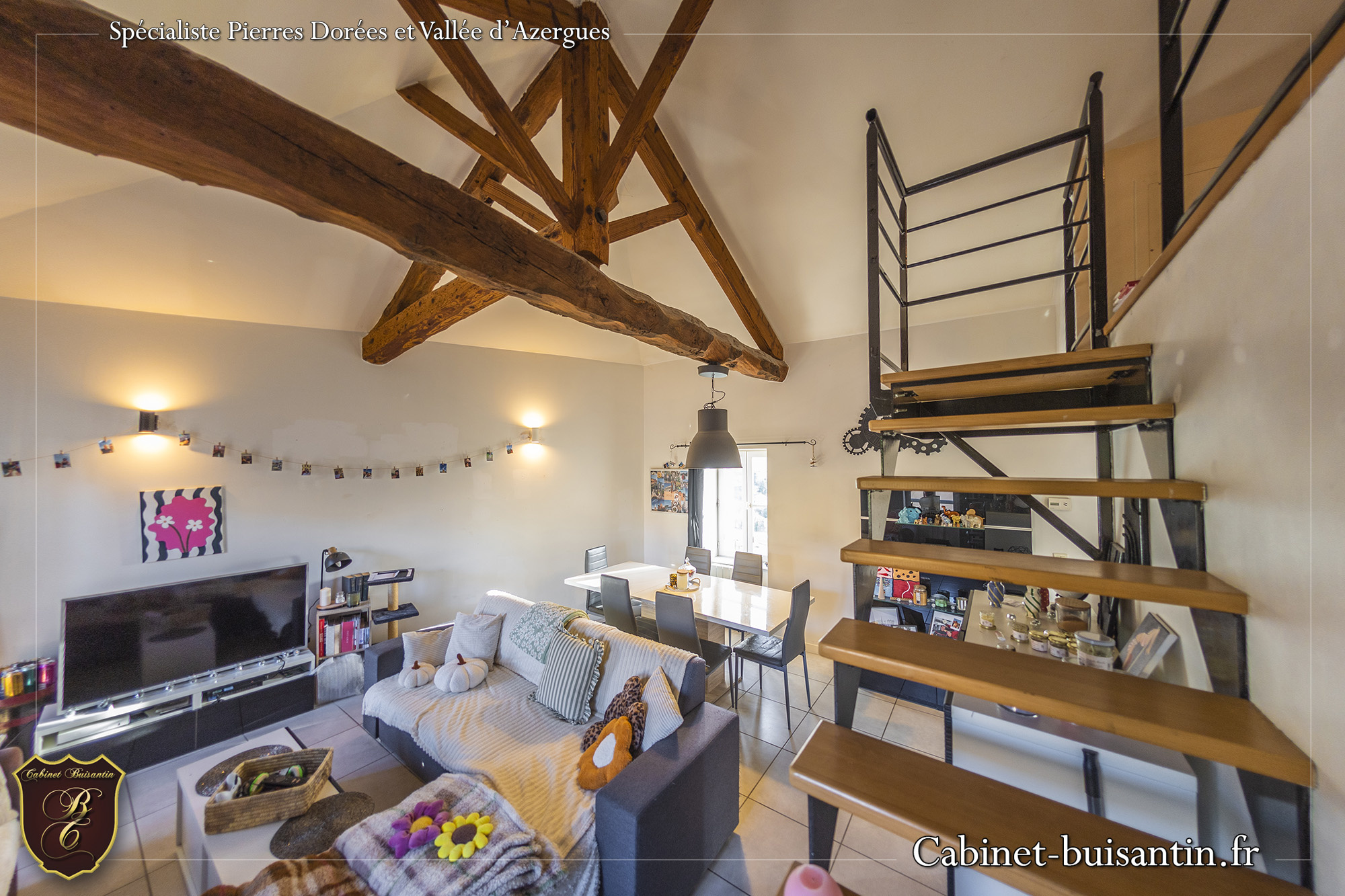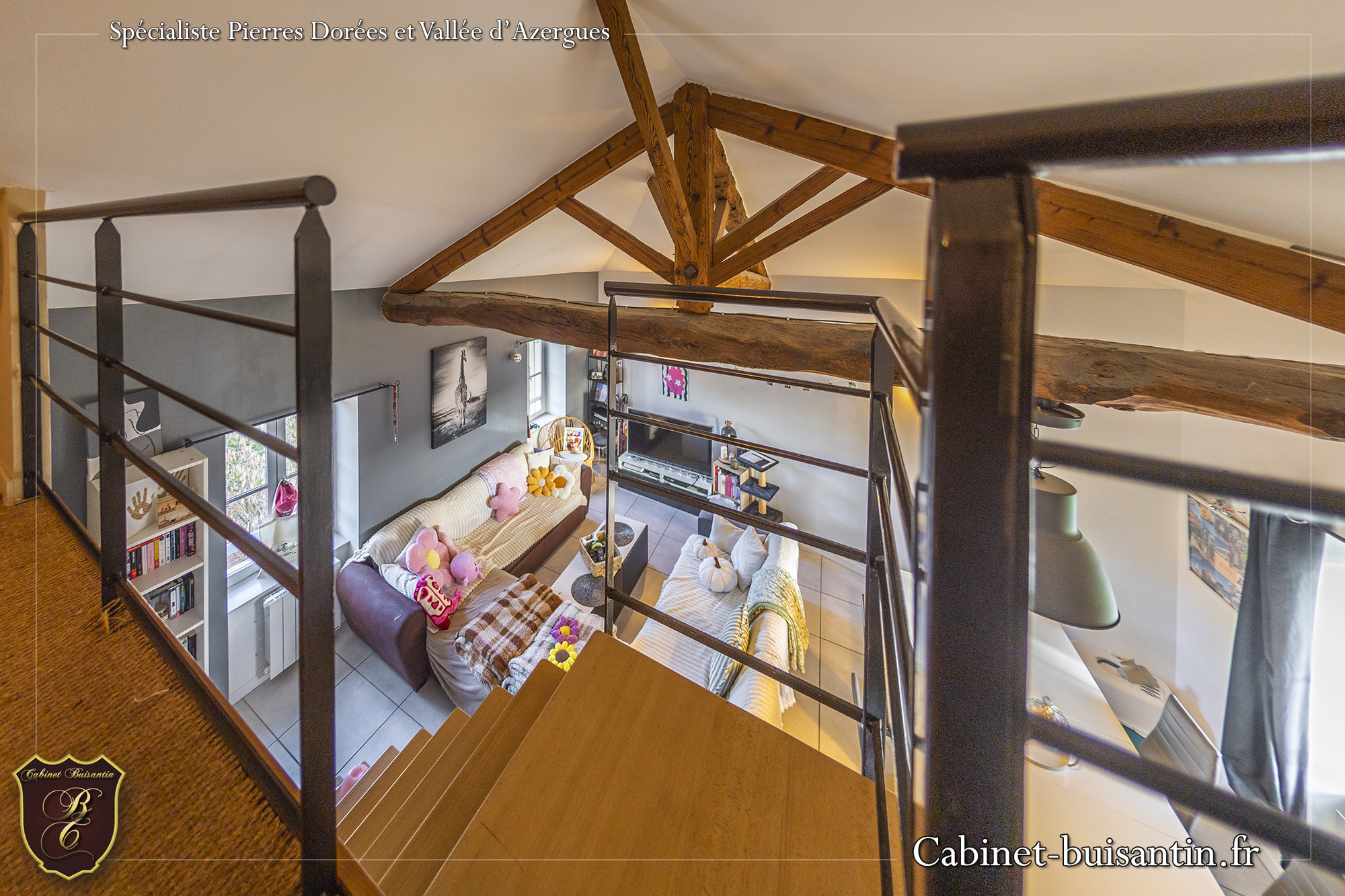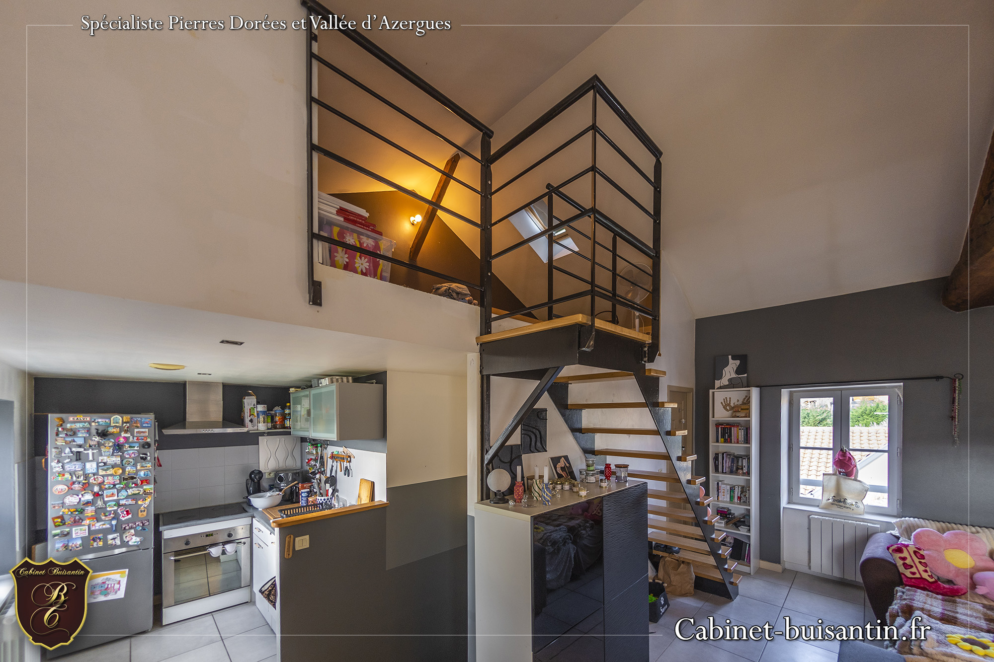 EXCLUSIVITE - SAINT LAURENT D'OINGT - Situé au centre village avec accès aux commodités à pied (école, arrêt de car, médecins, ...). Appartement en duplex dans petite copropriété d'environ 75 m2 habitables (67.05 m2 Loi Carrez) au 1er étage avec vue dégagée sur le vignoble et les collines. Il comprend: entrée, chambre, salle de bains et wc. A l'étage, cuisine équipée ouverte sur le séjour cathédral, mezzanine et chambre. Une cave complète ce bien. Appartement fonctionnel et lumineux, alliant le cachet de l'ancien et le confort du moderne. Raccordé à la fibre.